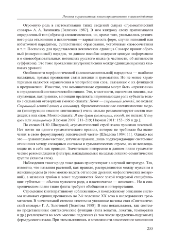 Словарный состав и грамматический строй традиционно считаются основными составными частями языковой системы. И описываются они соответственно в двух различных видах лингвистических трудов — словарях и грамматиках. Правда, в последнее время появляются новые виды описаний, совмещающие в себе знания о номинативных единицах языка и информацию о построении коммуникативных единиц. Имеются в виду словари интегративного типа. Начало этому лингвистическому направлению было положено «Толково-комбинаторным словарем» [Мельчук, Жолковский 1984], достоинства которого — еще до его публикации 254 в Вене — отмечал Л. П. Крысин в своей замечательной научно-популярной книге: «Средства, которые используются в толково-комбинаторном словаре, — гораздо более гибкие и разнообразные, чем средства обычных толковых словарей» [Крысин 1980: 90]. Вместе с тем, продолжим цитату, «значение и употребление иного слова оказываются столь сложными, что их бывает трудно уложить в жесткую форму словарной статьи, даже словарной статьи в толково-комбинаторном словаре. В то же время такую информацию не с руки давать и в грамматиках: речь-то идет о смысле, о содержании слова, а не о его грамматических характеристиках!» [Там же].