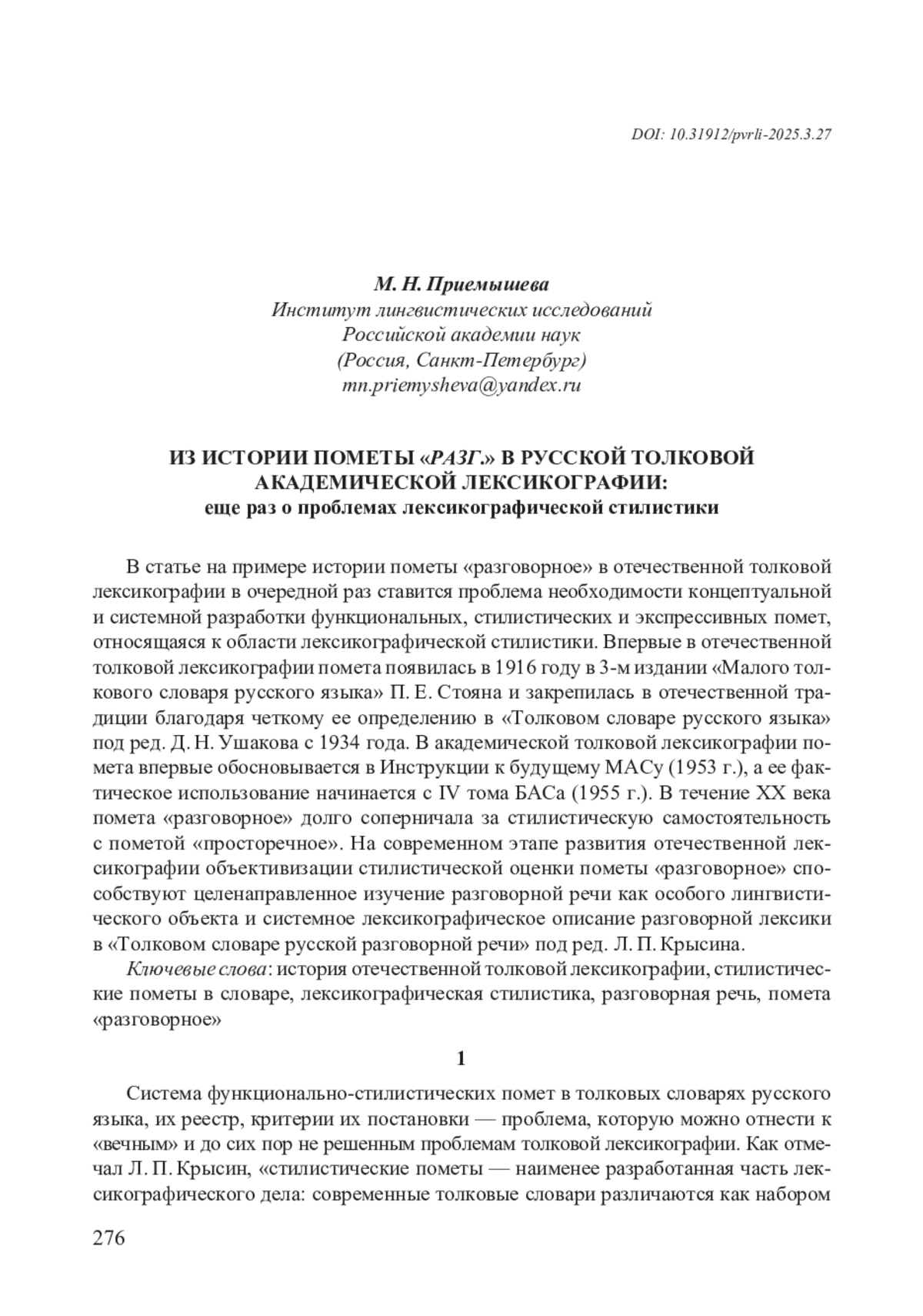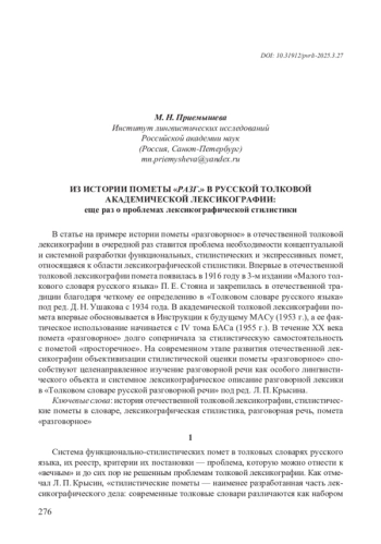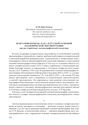 В статье на примере истории пометы «разговорное» в отечественной толковой лексикографии в очередной раз ставится проблема необходимости концептуальной и системной разработки функциональных, стилистических и экспрессивных помет, относящаяся к области лексикографической стилистики. Впервые в отечественной толковой лексикографии помета появилась в 1916 году в 3-м издании «Малого толкового словаря русского языка» П. Е. Стояна и закрепилась в отечественной традиции благодаря четкому ее определению в «Толковом словаре русского языка» под ред. Д. Н. Ушакова с 1934 года. В академической толковой лексикографии помета впервые обосновывается в Инструкции к будущему МАСу (1953 г.), а ее фактическое использование начинается с IV тома БАСа (1955 г.). В течение XX века помета «разговорное» долго соперничала за стилистическую самостоятельность с пометой «просторечное». На современном этапе развития отечественной лексикографии объективизации стилистической оценки пометы «разговорное» способствуют целенаправленное изучение разговорной речи как особого лингвистического объекта и системное лексикографическое описание разговорной лексики в «Толковом словаре русской разговорной речи» под ред. Л. П. Крысина.