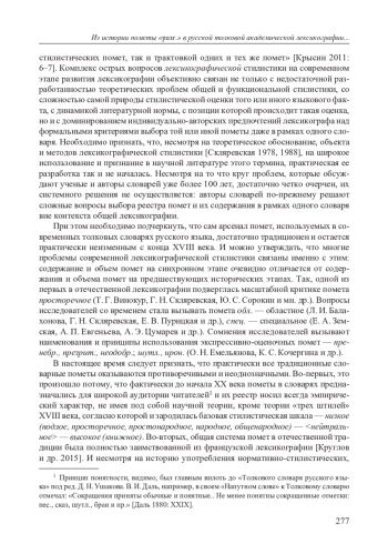 Система функционально-стилистических помет в толковых словарях русского языка, их реестр, критерии их постановки — проблема, которую можно отнести к «вечным» и до сих пор не решенным проблемам толковой лексикографии. Как отмечал Л. П. Крысин, «стилистические пометы — наименее разработанная часть лексикографического дела: современные толковые словари различаются как набором 277 стилистических помет, так и трактовкой одних и тех же помет» [Крысин 2011: 6–7]. Комплекс острых вопросов лексикографической стилистики на современном этапе развития лексикографии объективно связан не только с недостаточной разработанностью теоретических проблем общей и функциональной стилистики, со сложностью самой природы стилистической оценки того или иного языкового факта, с динамикой литературной нормы, с позиции которой происходит такая оценка, но и с доминированием индивидуально-авторских предпочтений лексикографа над формальными критериями выбора той или иной пометы даже в рамках одного словаря