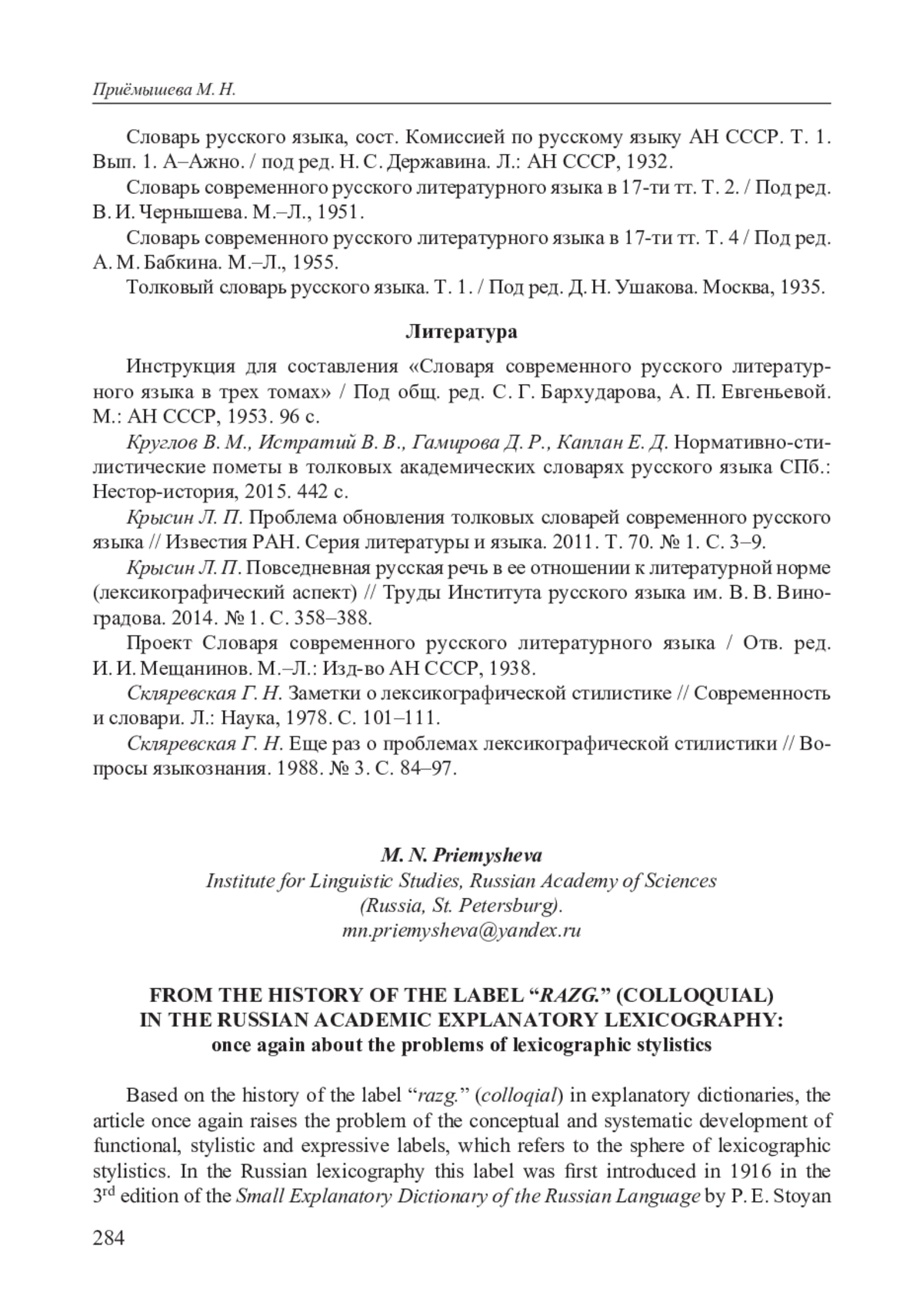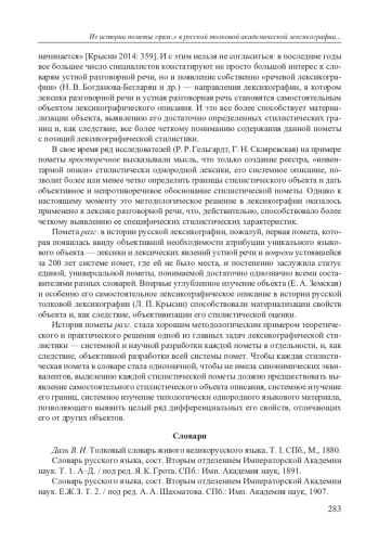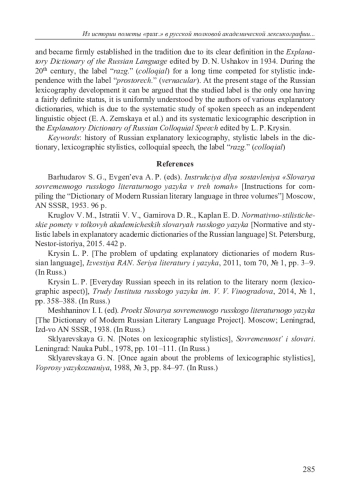 9. Круглов В. М., Истратий В. В., Гамирова Д. Р., Каплан Е. Д. Нормативно-стилистические пометы в толковых академических словарях русского языка СПб.: Нестор-история, 2015. 442 с. EDN: VBZMLJ