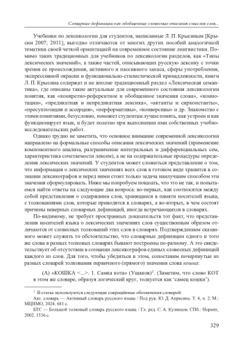Учебники по лексикологии для студентов, написанные Л. П. Крысиным [Крысин 2007; 2011], выгодно отличаются от многих других пособий аналогичной тематики своей четкой ориентацией на современное состояние лингвистики. Помимо таких традиционных для учебников по лексикологии разделов, как «Типы лексических значений», а также частей, описывающих русскую лексику с точки зрения ее происхождения, активного и пассивного запаса, сферы употребления, экспрессивной окраски и функционально-стилистической принадлежности, книги Л. П. Крысина содержат и не вполне традиционный раздел «Лексическая семантика», где описаны такие актуальные для современного состояния лексикологии понятия, как «конкретно-референтное и обобщенное значения слова», «коннотации», «предикатная и непредикатная лексика», «актанты и сирконстанты», «пресуппозиция и ассерция», «перформативы», «конверсивы» и др. Знакомство с этими понятиями, безусловно, поможет студентам лучше понять, как устроен и как функционирует язык, и будет полезно при выполнении ими собственных учебноиссле до вательских работ