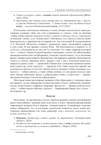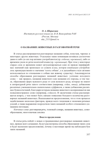 В статье речь пойдёт о новых и традиционных разговорных названиях животных, прежде всего домашних. Будут рассмотрены способы образования таких слов и будет высказано предположение, почему в настоящее время мы наблюдаем бум таких названий. 358 Поскольку разговорным названиям кошек была посвящена отдельная статья автора (см. [Шарыкина 2023]), в данной работе они, к сожалению, не упоминаются, хотя, безусловно, эти наименования являются самыми многочисленными и разнообразными