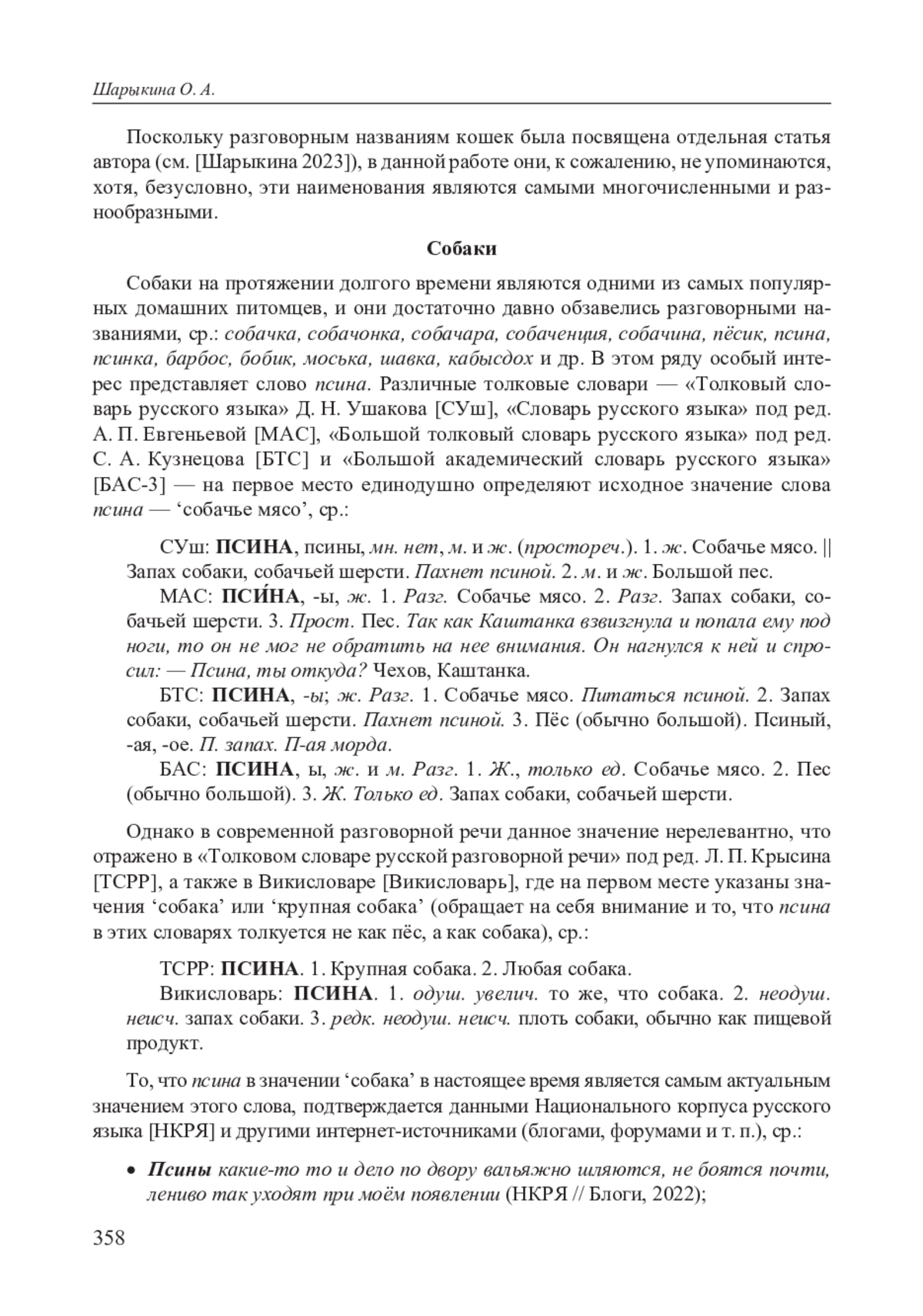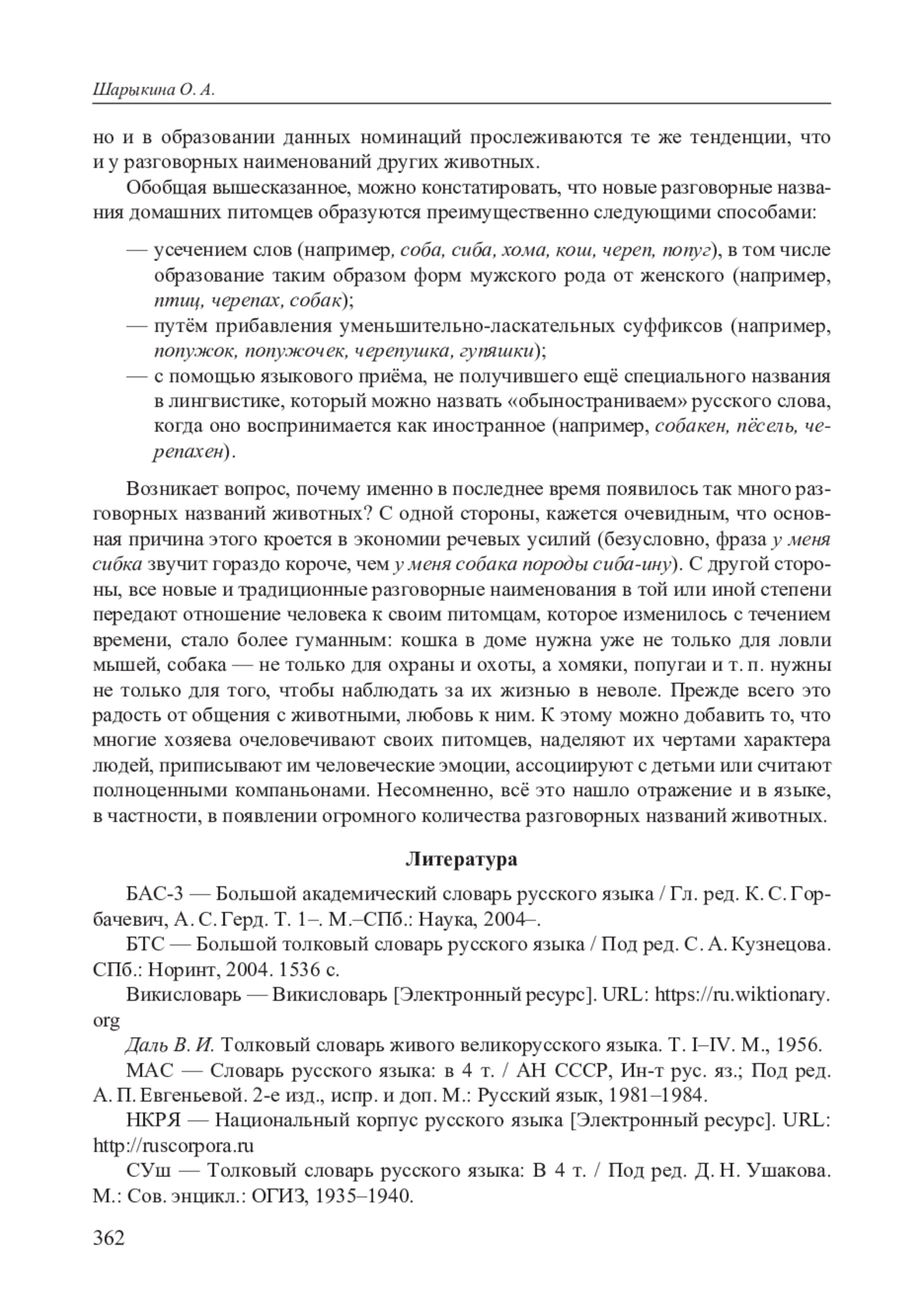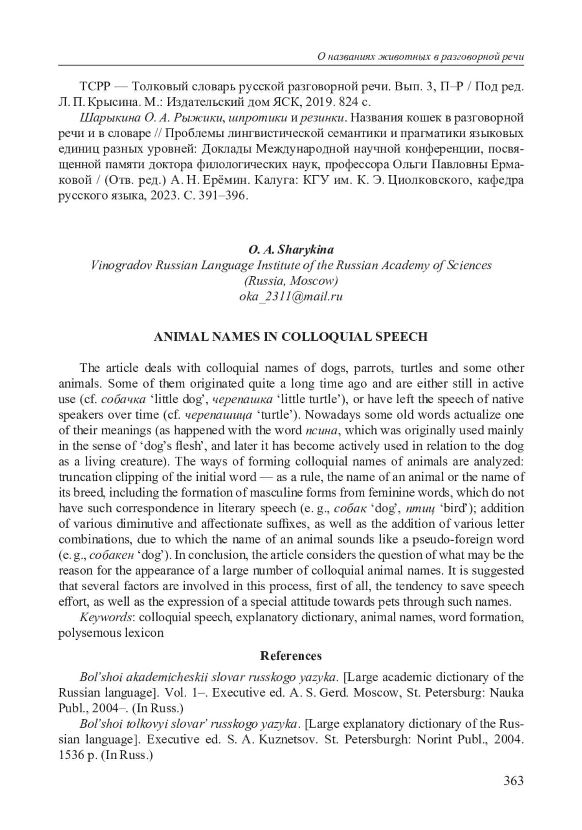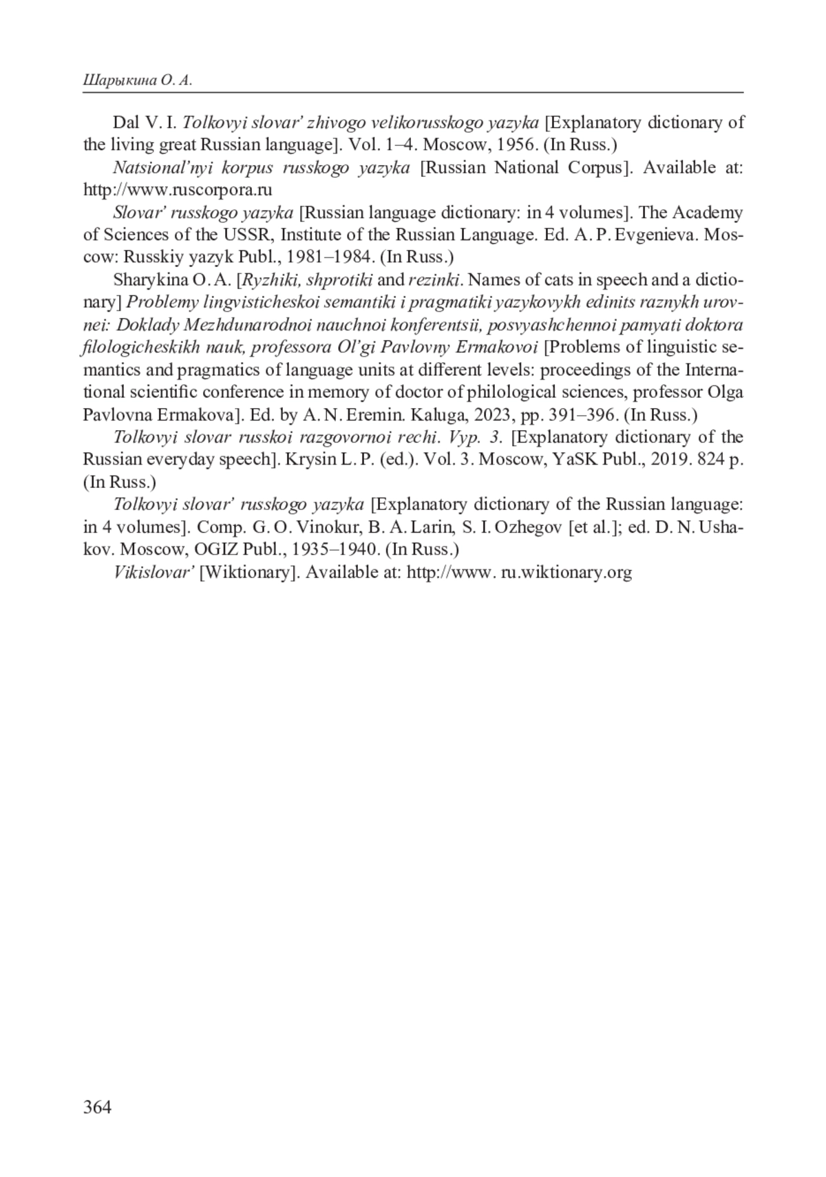 9. Шарыкина О. А. Рыжики, шпротики и резинки. Названия кошек в разговорной речи и в словаре // Проблемы лингвистической семантики и прагматики языковых единиц разных уровней: Доклады Международной научной конференции, посвященной памяти доктора филологических наук, профессора Ольги Павловны Ермаковой /(Отв.ред.) А. Н. Ерёмин. Калуга: КГУ им. К. Э. Циолковского, кафедра русского языка, 2023. С. 391-396. EDN: FQKXCM