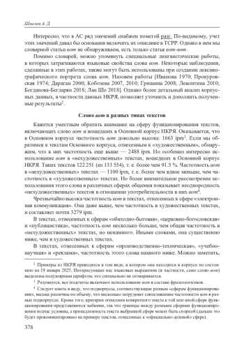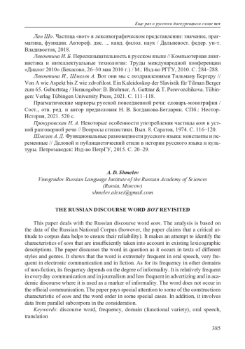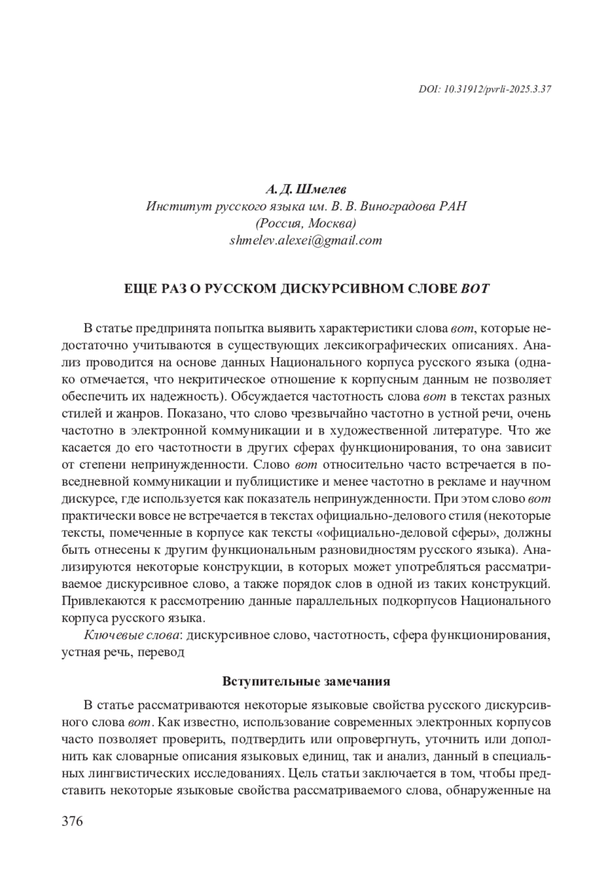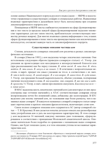 В статье рассматриваются некоторые языковые свойства русского дискурсивного слова вот. Как известно, использование современных электронных корпусов часто позволяет проверить, подтвердить или опровергнуть, уточнить или дополнить как словарные описания языковых единиц, так и анализ, данный в специальных лингвистических исследованиях. Цель статьи заключается в том, чтобы представить некоторые языковые свойства рассматриваемого слова, обнаруженные на 377 основе данных Национального корпуса русского языка (далее — НКРЯ) и недостаточно отраженные в существующих словарях и специальных работах. Выявленные языковые характеристики в дальнейшем могут быть использованы при создании лексикографического портрета вот