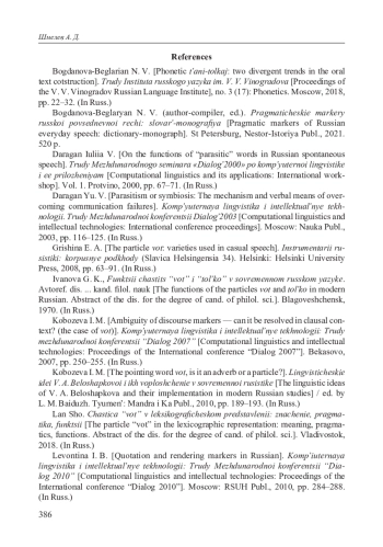 10. Дараган Ю. В. Функции слов-“паразитов” в русской спонтанной речи // Труды Международного семинара “Диалог’2000” по компьютерной лингвистике и ее приложениям. Т. 1. Теоретические проблемы. Протвино: Наука, 2000. С. 67-71.