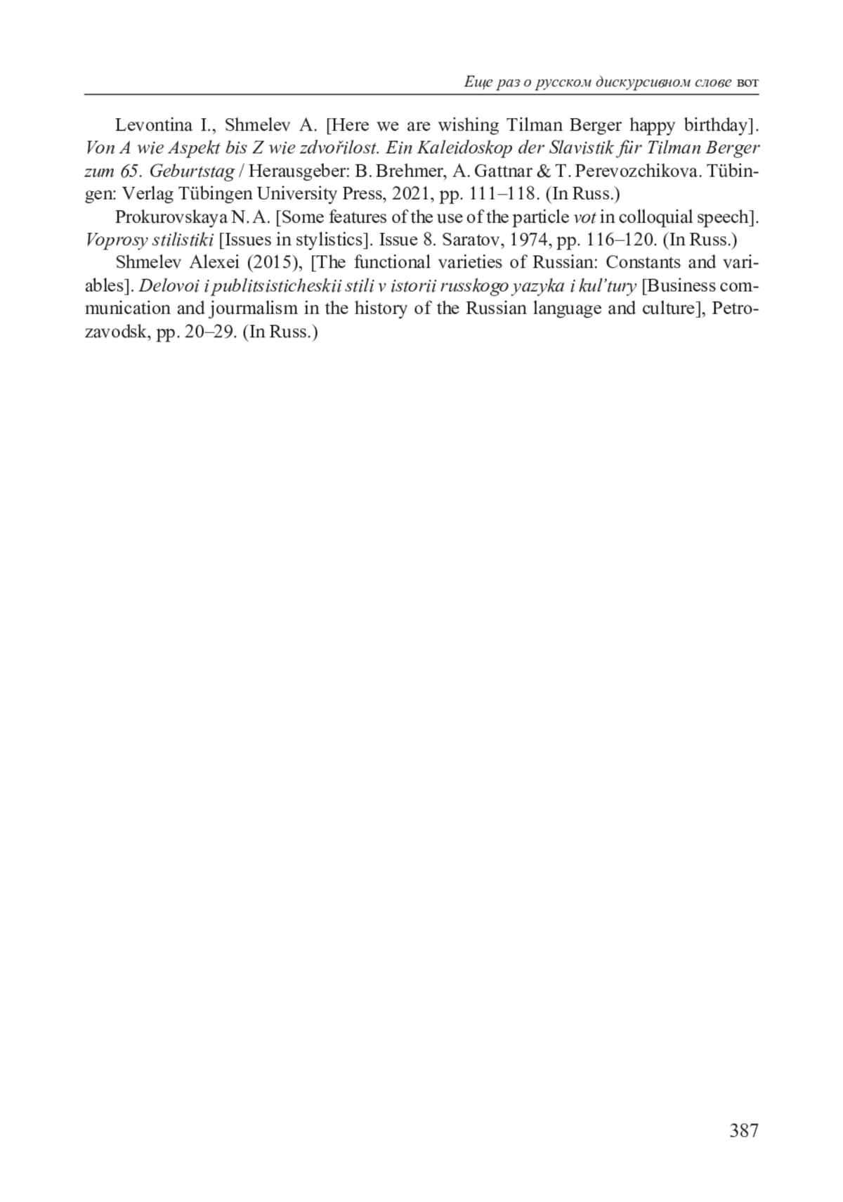 17. Левонтина И., Шмелев А. Вот они мы с поздравлениями Тильману Бергеру // Von A wie Aspekt bis Z wie zdvořilost. Ein Kaleidoskop der Slavistik für Tilman Berger zum 65. Geburtstag / Herausgeber: B. Brehmer, A. Gattnar & T. Perevozchikova. Tübingen: Verlag Tübingen University Press, 2021. С. 111-118.