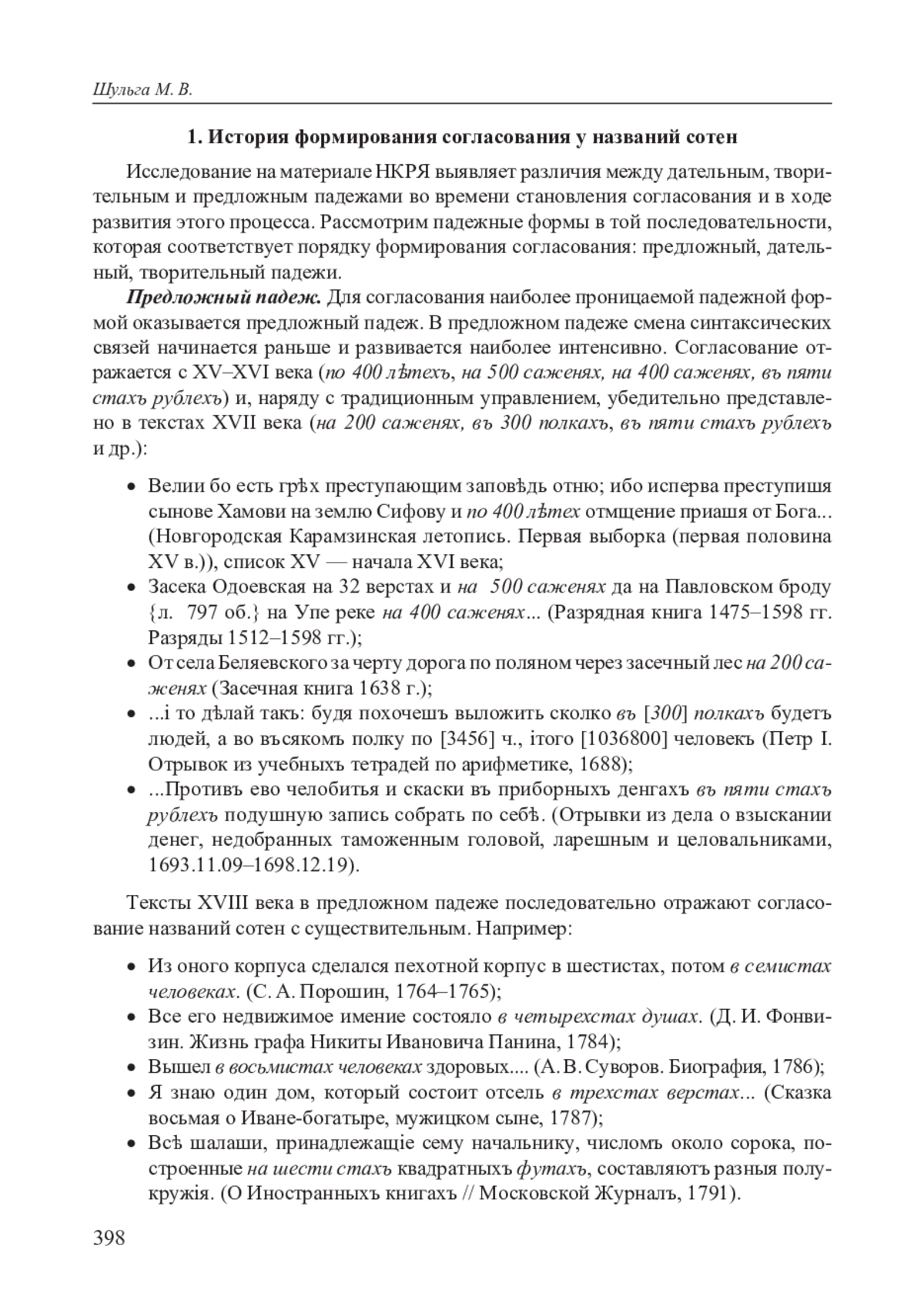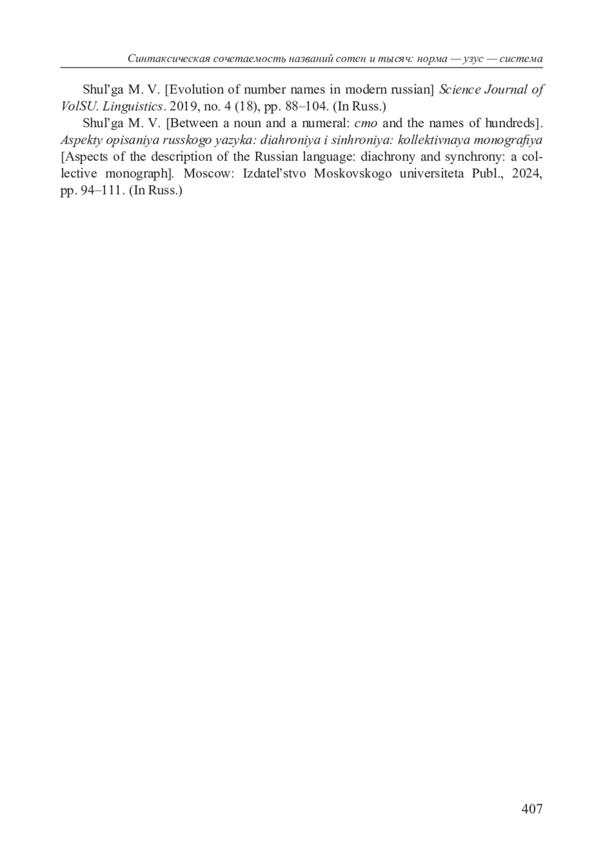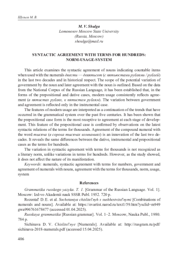 7. Шульга М. В. Между существительным и числительным: сто и названия сотен // Аспекты описания русского языка: диахрония и синхрония: коллективная монография /О. Н. Григорьева, В. В. Каверина, А. Б. Коконова и др.; отв. ред.: М. Л. Ремнёва. М.: Издательство Московского университета, 2024. С. 94-111