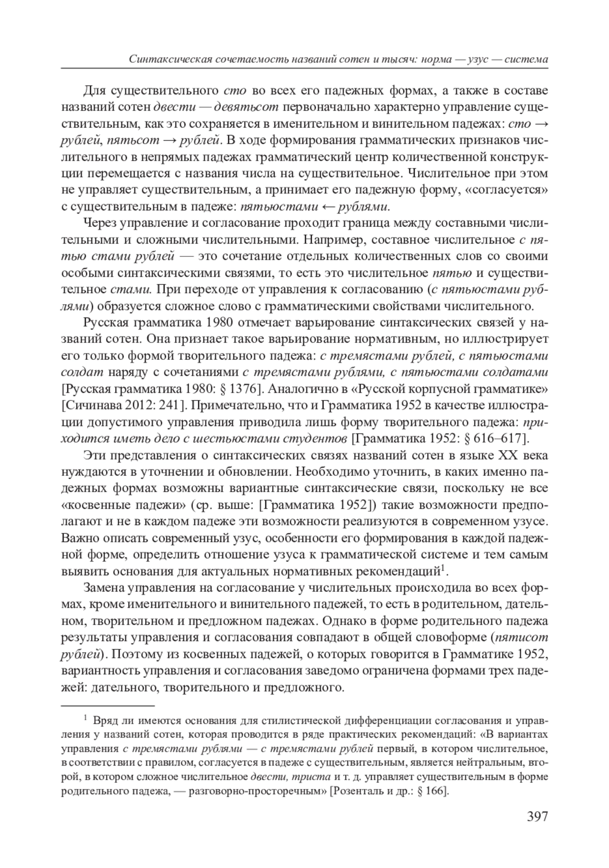 Грамматическая история числительного сто и названий сотен описана в [Шульга 2024: 94–111]. Мы остановимся на синтаксических связях названий сотен с существительными, называющими считаемые предметы. 397 Для существительного сто во всех его падежных формах, а также в составе названий сотен двести — девятьсот первоначально характерно управление существительным, как это сохраняется в именительном и винительном падежах: сто → рублей, пятьсот → рублей. В ходе формирования грамматических признаков числительного в непрямых падежах грамматический центр количественной конструкции перемещается с названия числа на существительное. Числительное при этом не управляет существительным, а принимает его падежную форму, «согласуется» с существительным в падеже: пятьюстами ← рублями