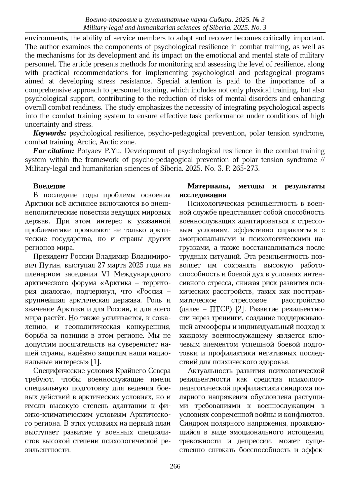 10. Потяев П.Ю. Психолого-педагогическая профилактика синдрома полярного напряжения у военнослужащих арктических войск на основе педагогического моделирования боевых действий / П.Ю. Потяев, Е.И. Федак // Военно-правовые и гуманитарные науки Сибири. 2024. № 2 (20). С. 280-290. EDN: VVTHNV