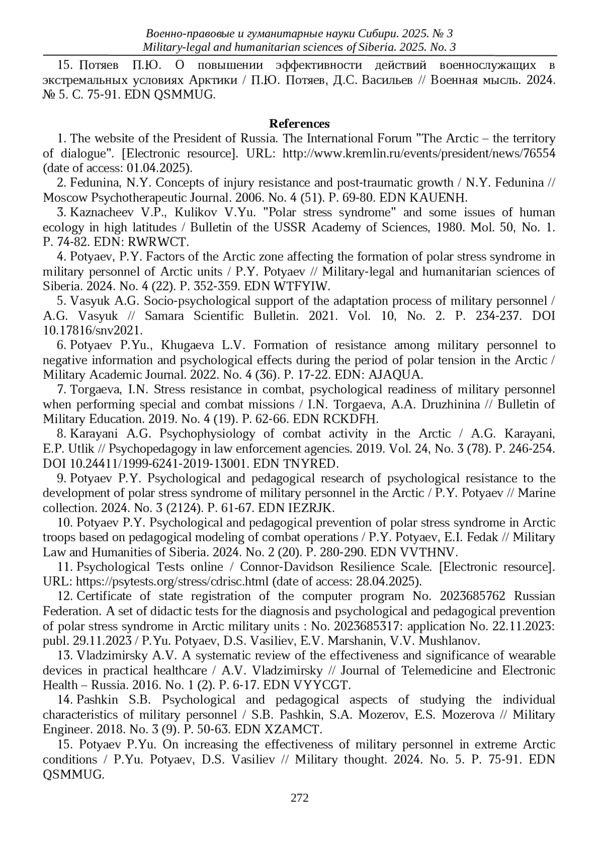 9. Потяев П.Ю. Психолого-педагогическое исследование психологической устойчивости к развитию синдрома полярного напряжения военнослужащих в Арктике / П.Ю. Потяев // Морской сборник. 2024. № 3 (2124). С. 61-67. EDN: IEZRJK