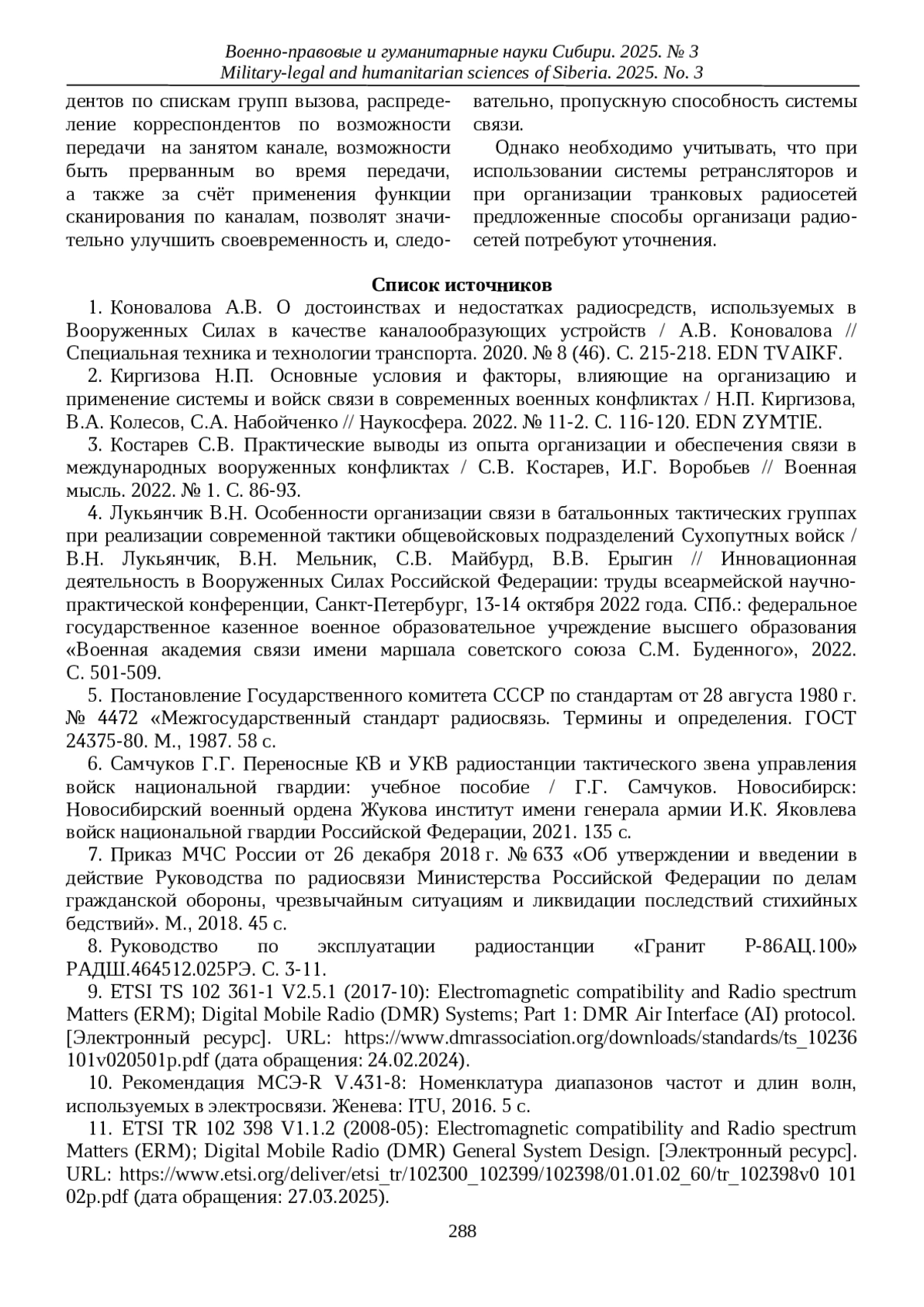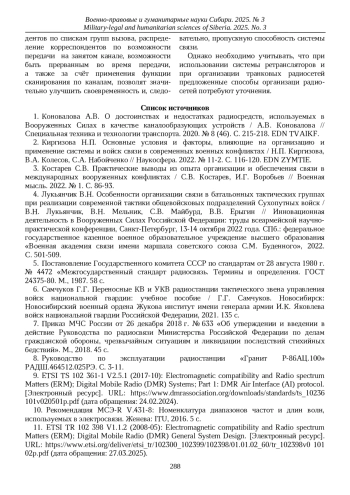 3. Костарев С.В. Практические выводы из опыта организации и обеспечения связи в международных вооруженных конфликтах / С.В. Костарев, И.Г. Воробьев // Военная мысль. 2022. № 1. С. 86-93. EDN: BIHABX