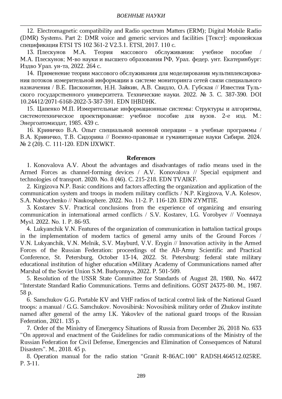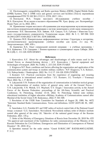 2. Киргизова Н.П. Основные условия и факторы, влияющие на организацию и применение системы и войск связи в современных военных конфликтах / Н.П. Киргизова, В.А. Колесов, С.А. Набойченко // Наукосфера. 2022. № 11-2. С. 116-120. EDN: ZYMTIE