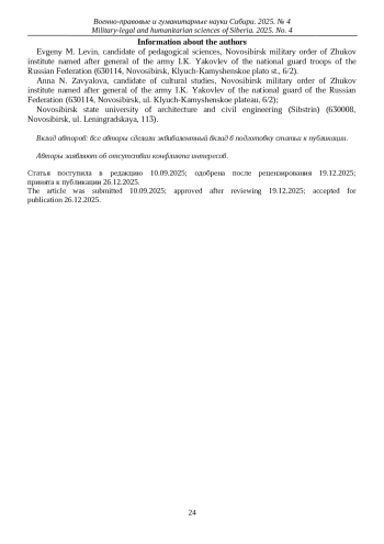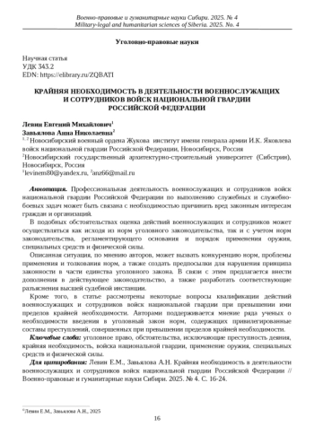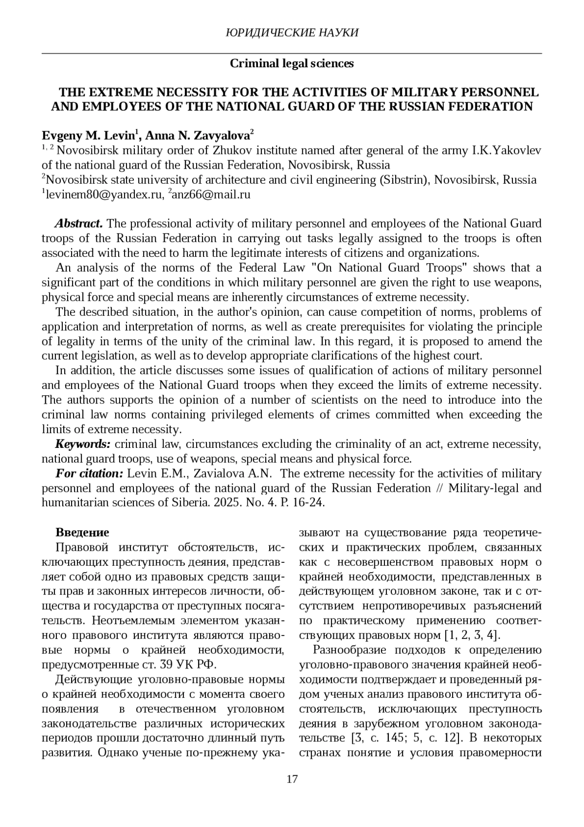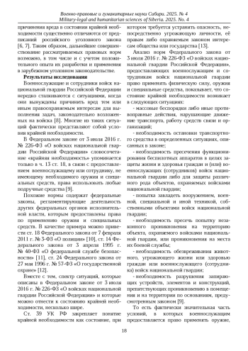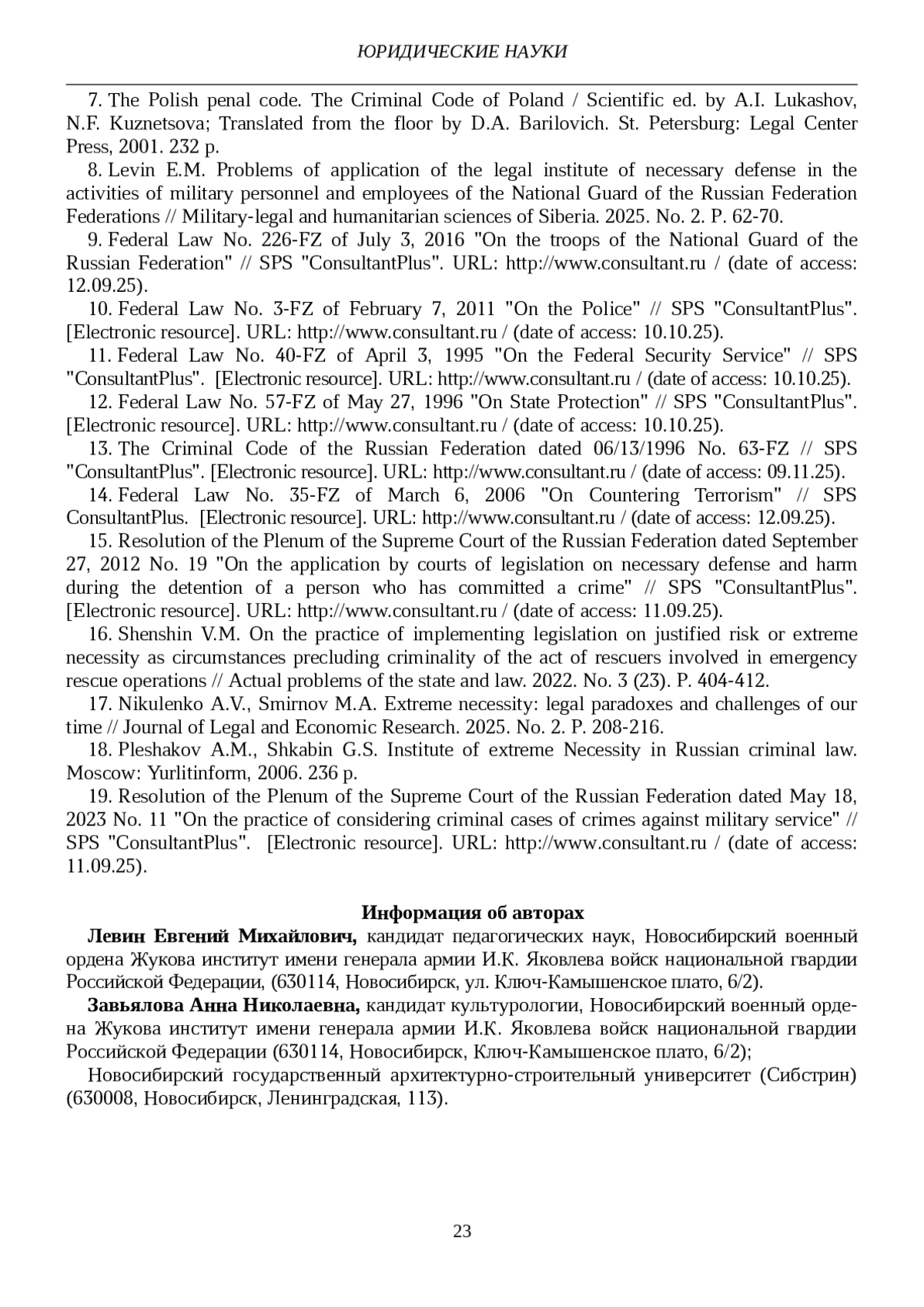 8. Левин Е.М. Проблемы применения правового института необходимой обороны в деятельности военнослужащих и сотрудников войск национальной гвардии Российской Федерации // Военно-правовые и гуманитарные науки Сибири. 2025. № 2. С. 62-70. EDN: VCBXQI