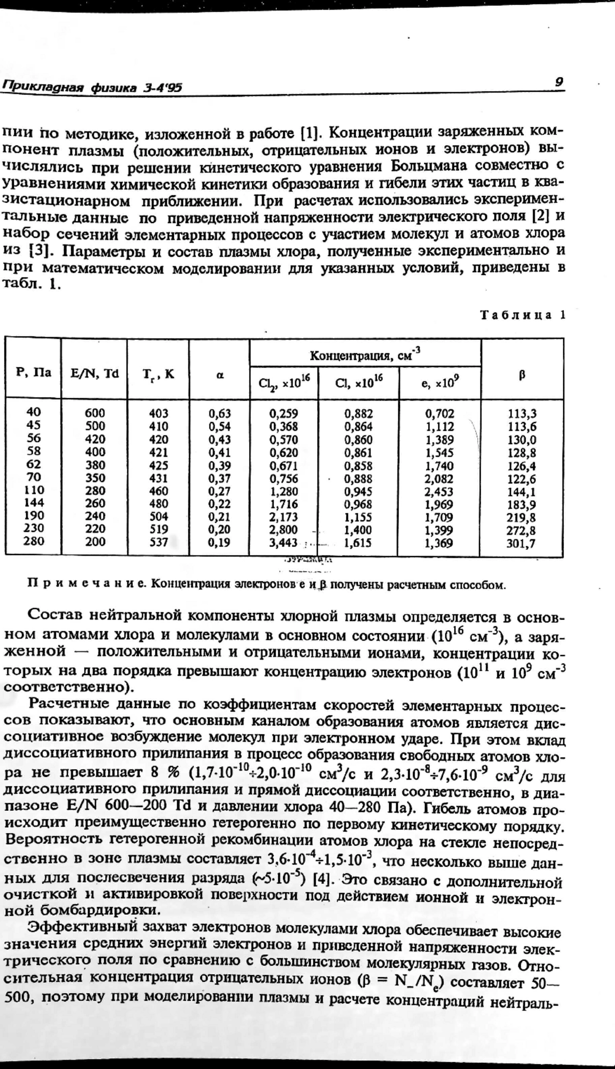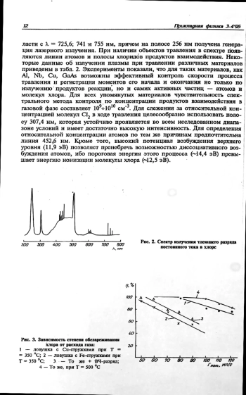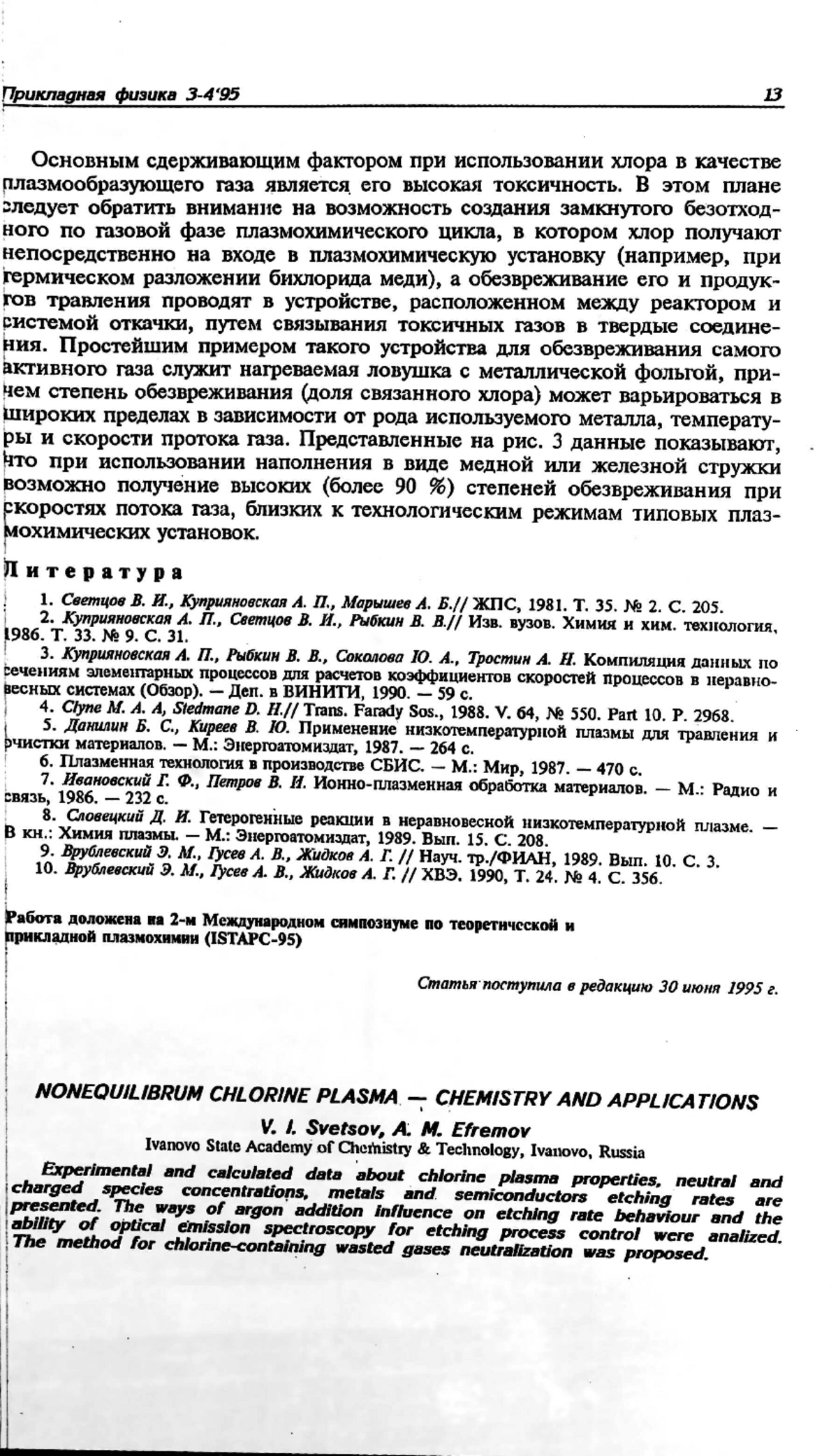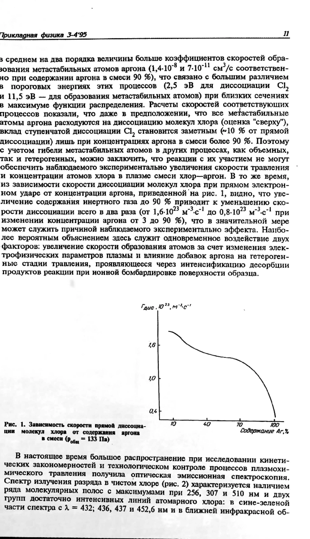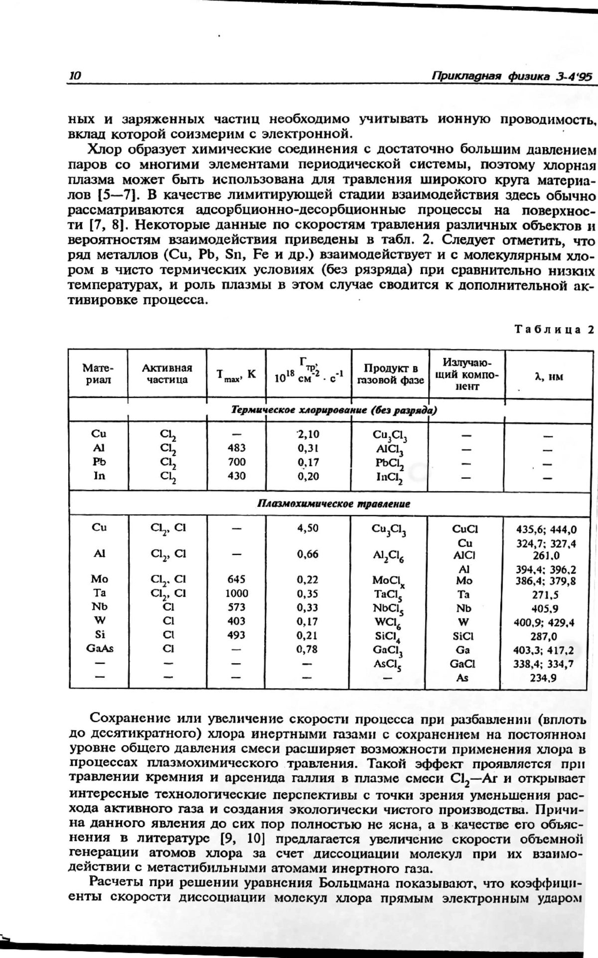 Приведены экспериментальные и расчетные данные по параметрам и количественному составу нейтральной и заряженной компонент хлорной плазмы, а также по скоростям термического и плазмохимического травления металлов и полупроводников. Рассмотрены механизмы влияния добавок аргона на скорость травления и возможности эмиссионной спектроскопии для контроля процесса травления. Предложены пути обезвреживания хлора в отходящих газах плазмохимических установок