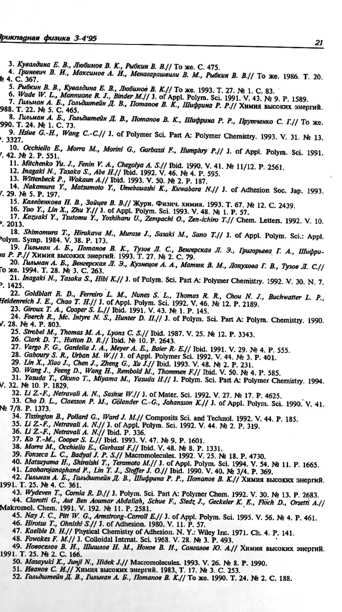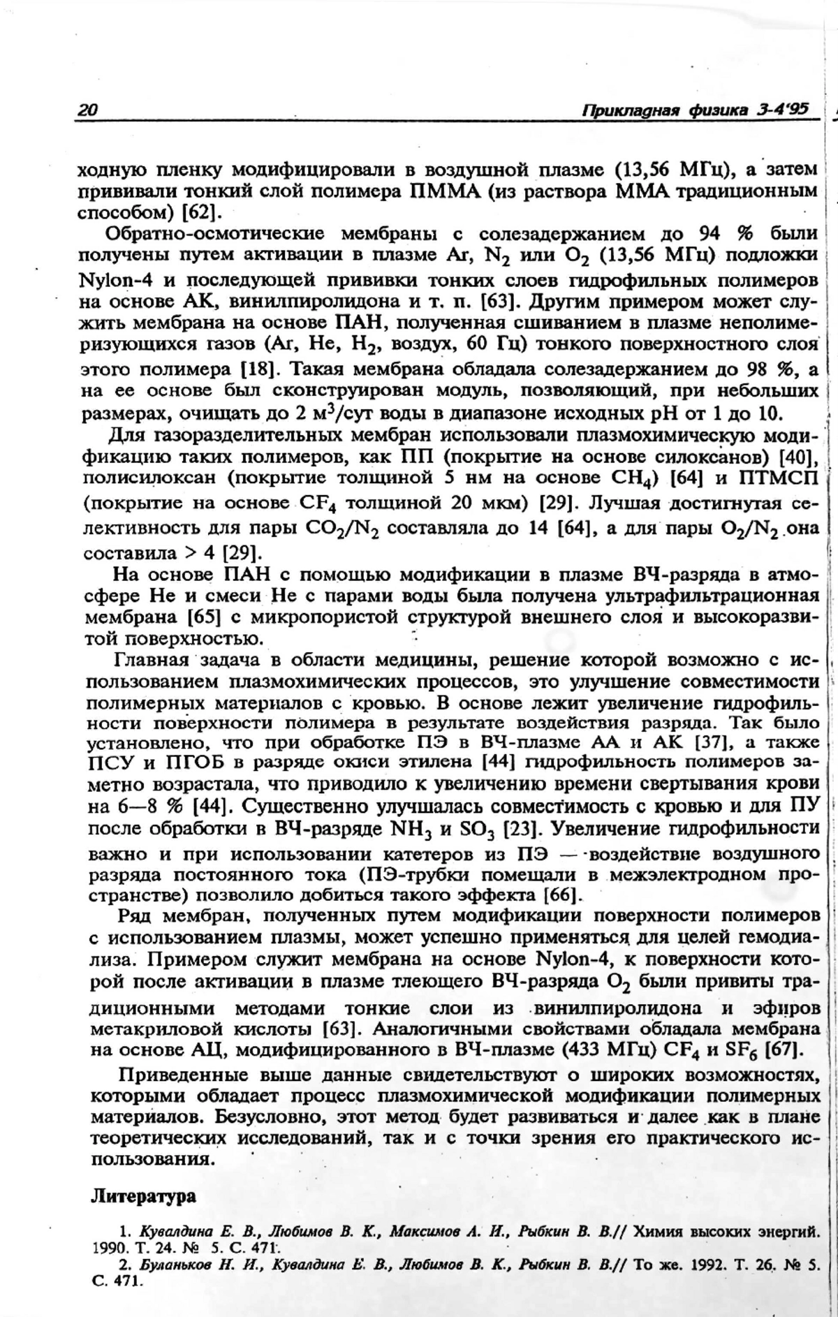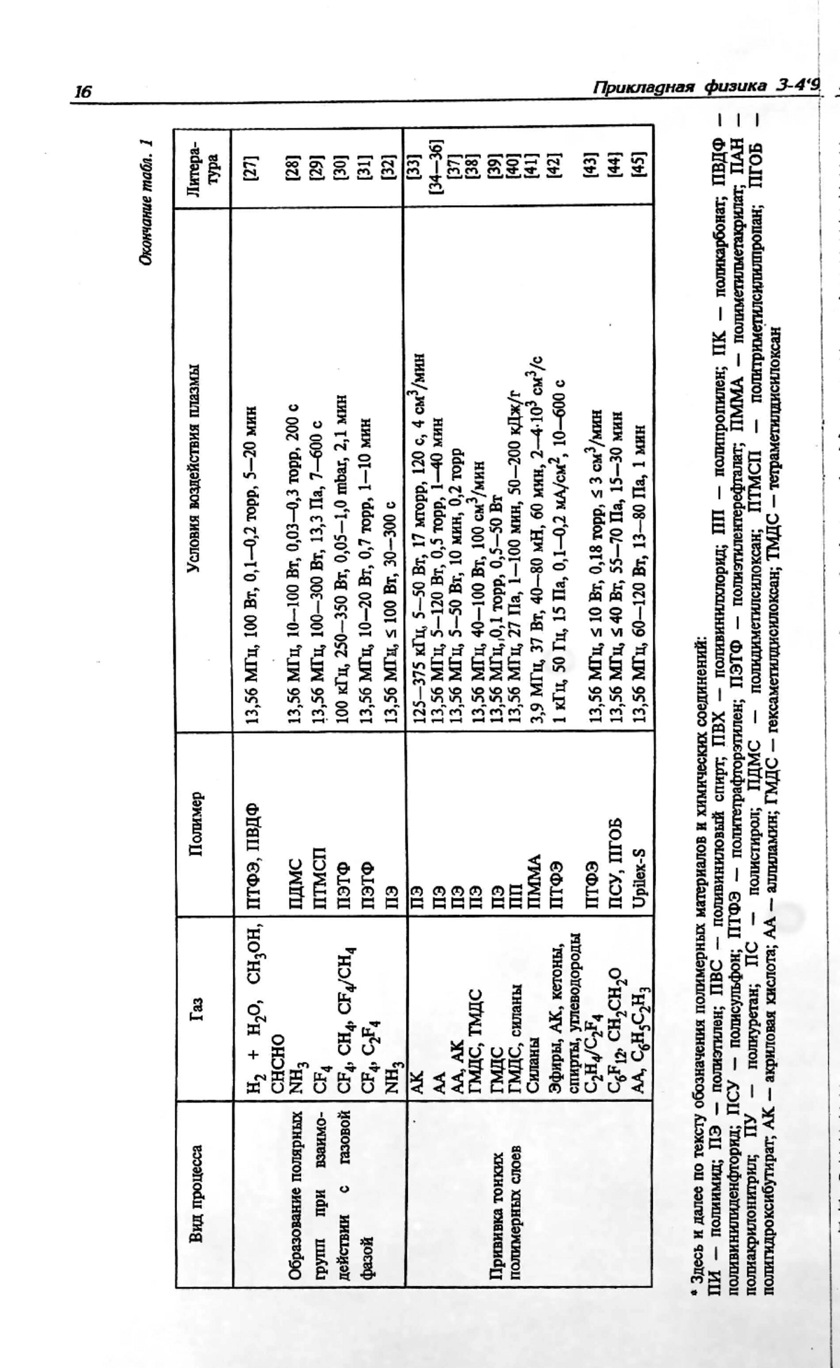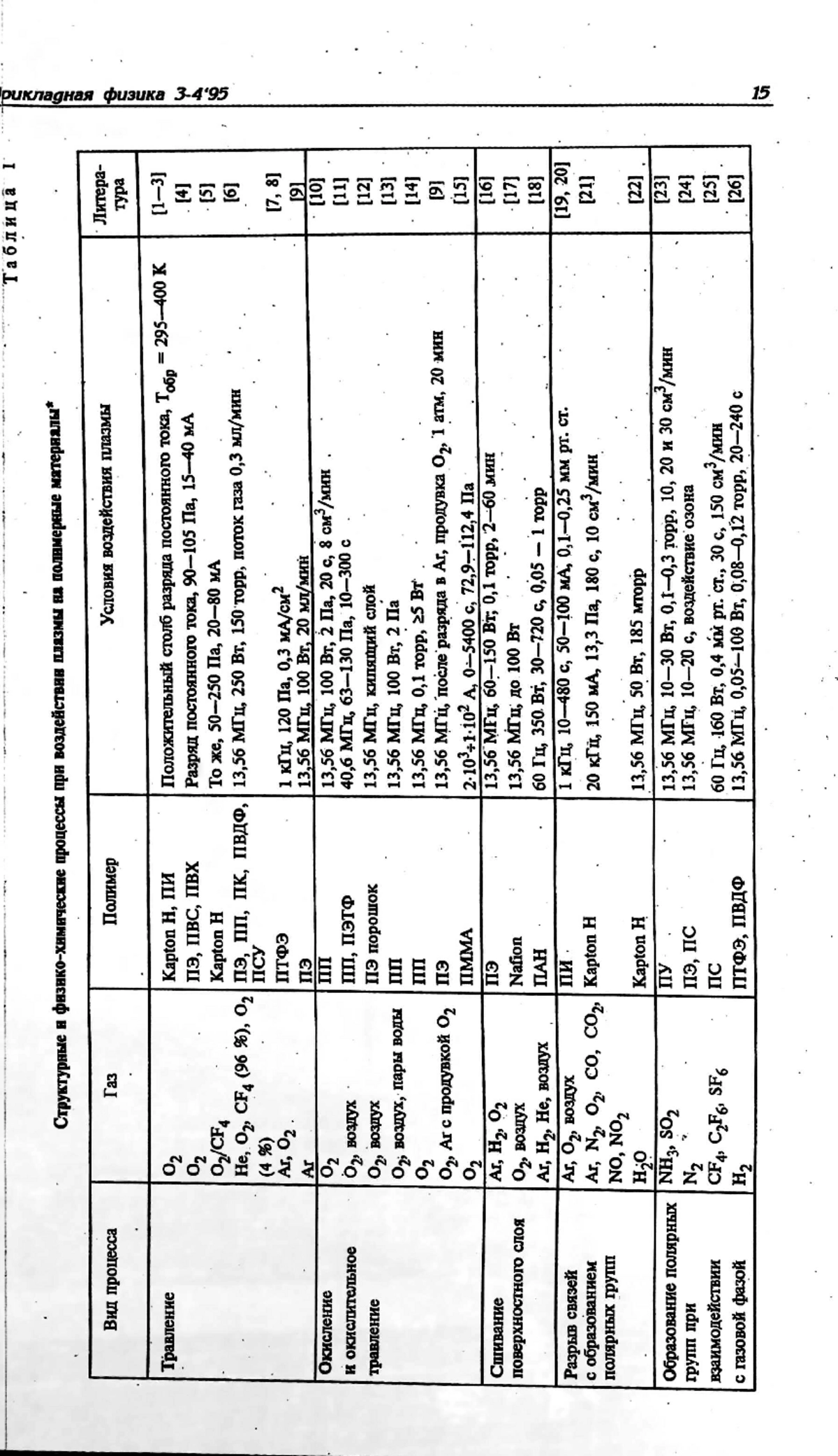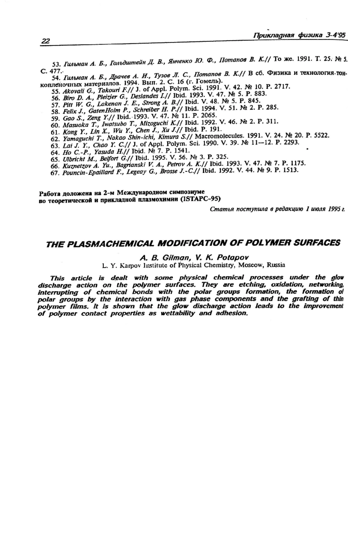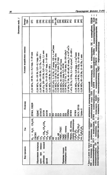 Рассмотрены физико-химические процессы, происходящие при воздействии плазмы тлеющего разряда на поверхности полимерных материалов: травление, окисление, сшивание, разрыв связей с образованием полярных групп, образование полярных групп при взаимодействии с компонентами газовой фазы и прививка тонких полимерных слоев. Показано, что воздействие плазмы приводит к улучшению контактных свойств полимеров, в частности, смачивания и адгезии