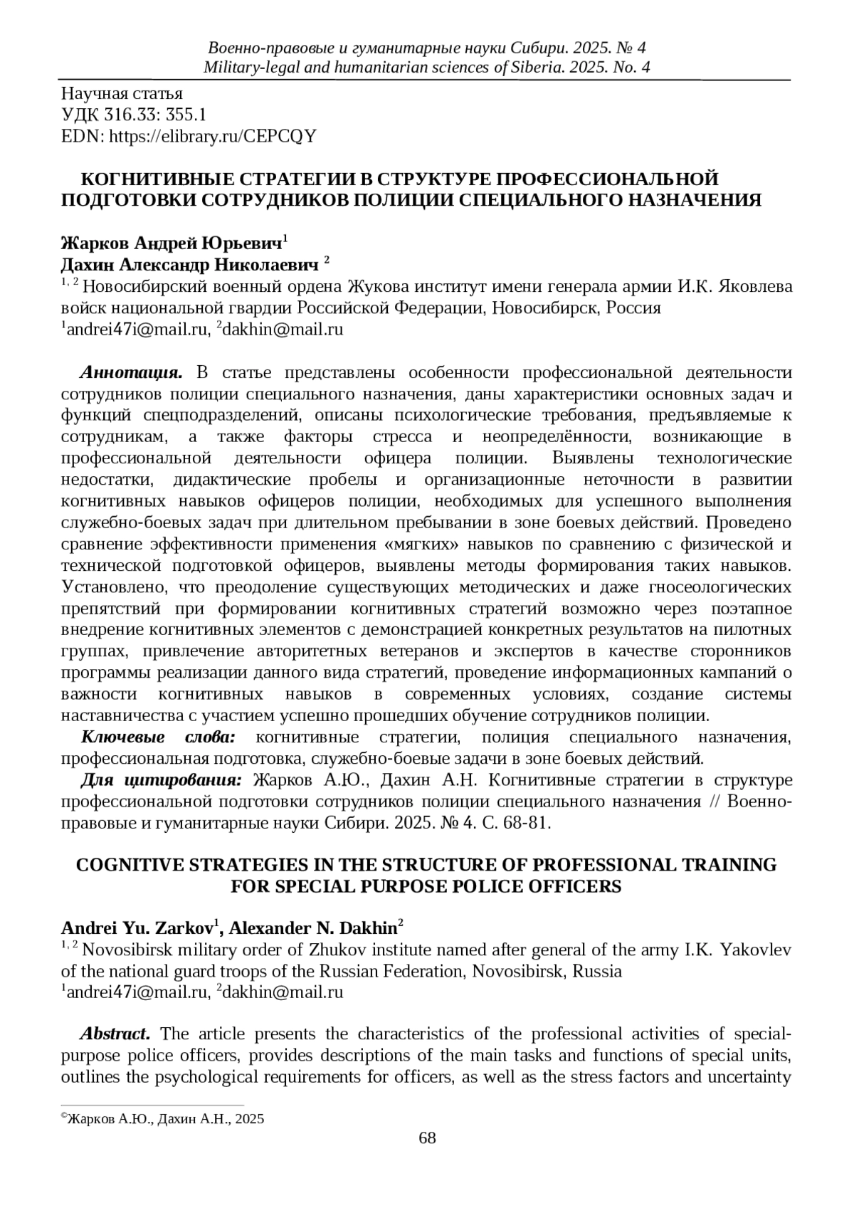 12. Федак Е.И., Егоров А.А. Влияние упражнений армейской тактической стрельбы на психологическую готовность военнослужащих штурмовых групп // Военно-правовые и гуманитарные науки Сибири. 2025. № 2. С. 336-345. EDN: LDAEKG