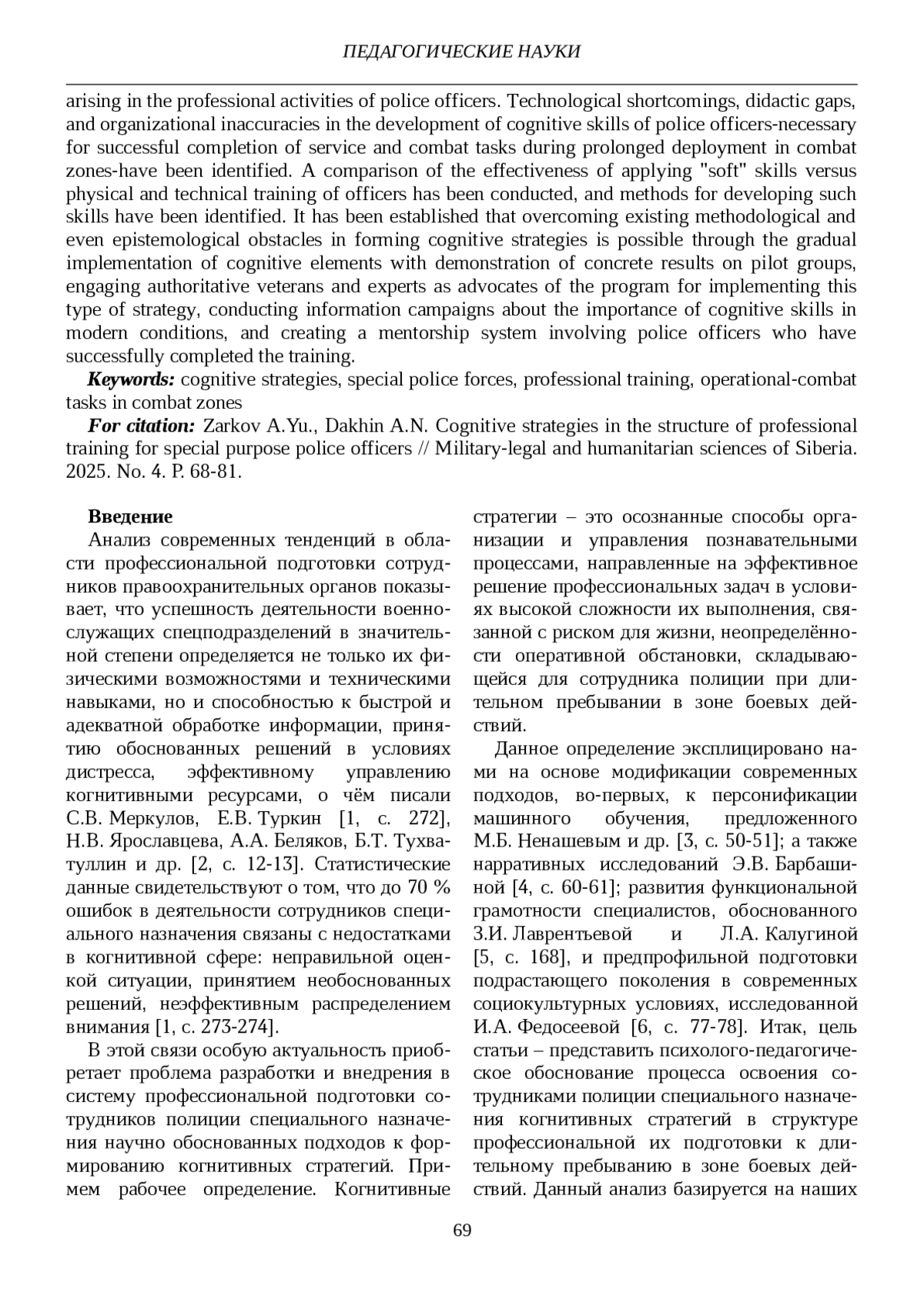 В статье представлены особенности профессиональной деятельности сотрудников полиции специального назначения, даны характеристики основных задач и функций спецподразделений, описаны психологические требования, предъявляемые к сотрудникам, а также факторы стресса и неопределённости, возникающие в профессиональной деятельности офицера полиции. Выявлены технологические недостатки, дидактические пробелы и организационные неточности в развитии когнитивных навыков офицеров полиции, необходимых для успешного выполнения служебно-боевых задач при длительном пребывании в зоне боевых действий. Проведено сравнение эффективности применения «мягких» навыков по сравнению с физической и технической подготовкой офицеров, выявлены методы формирования таких навыков. Установлено, что преодоление существующих методических и даже гносеологических препятствий при формировании когнитивных стратегий возможно через поэтапное внедрение когнитивных элементов с демонстрацией конкретных результатов на пилотных группах, привлечение авторитетных ветеранов и экспертов в качестве сторонников программы реализации данного вида стратегий, проведение информационных кампаний о важности когнитивных навыков в современных условиях, создание системы наставничества с участием успешно прошедших обучение сотрудников полиции.