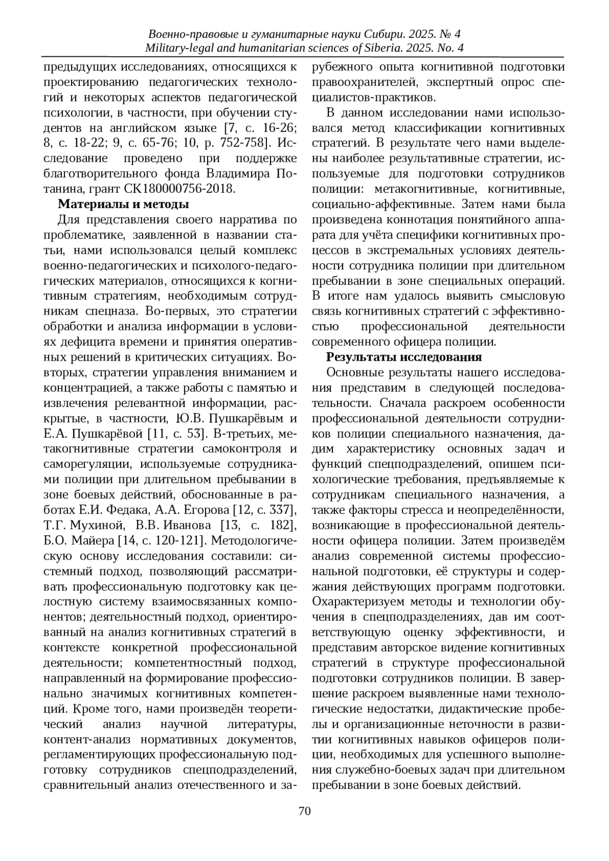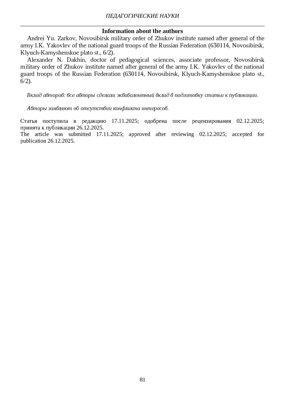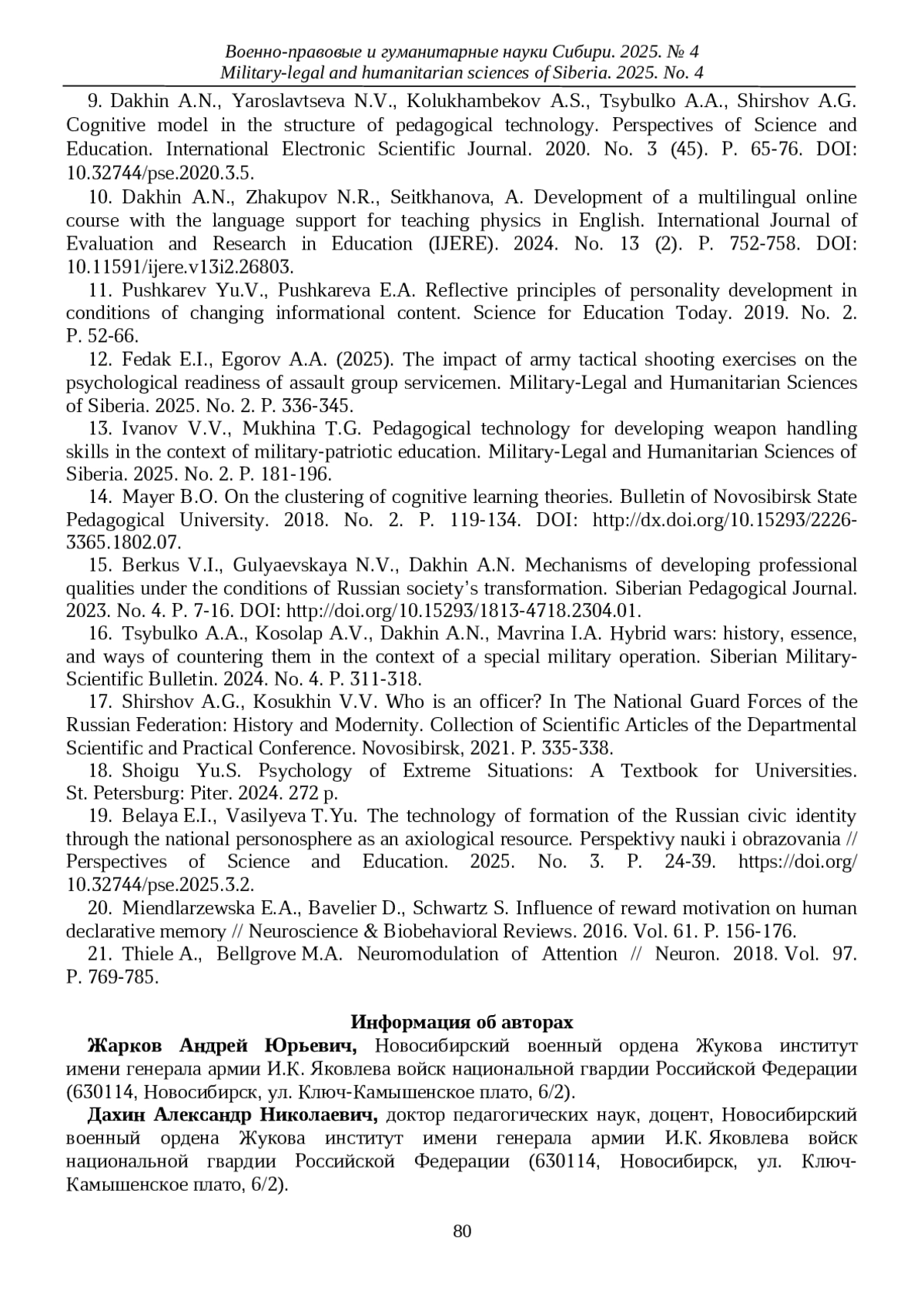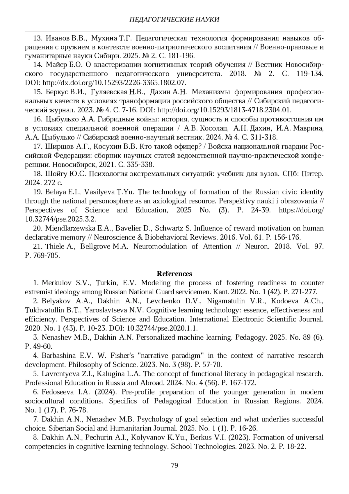 13. Иванов В.В., Мухина Т.Г. Педагогическая технология формирования навыков обращения с оружием в контексте военно-патриотического воспитания // Военно-правовые и гуманитарные науки Сибири. 2025. № 2. С. 181-196. EDN: ELLYOB