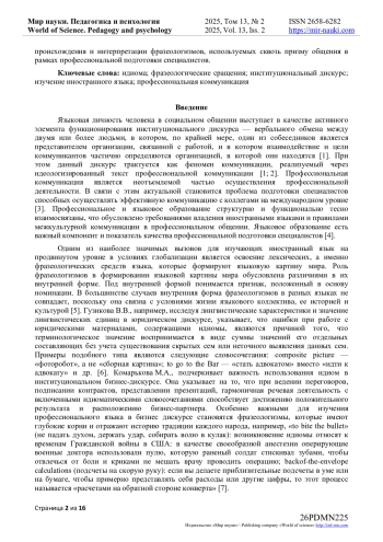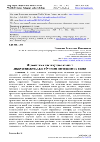 В статье отмечается целесообразность включения фразеологических сращений в учебный материал при обучении иностранному языку для подготовки специалистов, способных осуществлять профессиональную деятельность на иностранном языке в рамках межкультурной коммуникации, которая стала неотъемлемой частью жизни и работы современного общества. Материалом исследования послужили устойчивые словосочетания и выражения, характерные для различных видов институционального дискурса. С этой целью в статье проведен анализ русских, английских, американских, латинских и французских идиом. Исследование идиоматики идеологизированных текстов языковых личностей разных институтов как интегративной части национальной коммуникации предполагает проведение компонентного анализа. В данной статье обращается внимание на то, что идиома является отражением исторических, политических, культурологических, лингвистических, религиозных, этнологических, философских и иных процессов, которые происходят от эпохи к эпохе в каждой стране среди разных народов и фиксируются в языковом коде; также указывается, что наиболее характерное использование фразеологических сращений проявляется в живой речи человека - дискурсе, включая профессиональный язык, которому также присущи черты метафоричности. Исследуемые языковые единицы отражают эмоциональный фон говорящего, создают определенную атмосферу для коммуникации, позволяют подчеркнуть важные аспекты явлений метафорического переноса и др. При этом незнание смысла конкретного выражения осложняет взаимопонимание, что обусловливает целесообразность изучения идиом на занятиях по иностранному языку. Добиться конструктивного общения и достичь полного понимания в диалоге или полилоге возможно только с учётом понимания этимологии устойчивых словосочетаний и выражений. В статье делается акцент на актуальности изучения идиом в контексте институциональности, доказывается необходимость раскрытия на занятиях по изучению иностранного языка происхождения и интерпретации фразеологизмов, используемых сквозь призму общения в рамках профессиональной подготовки специалистов.