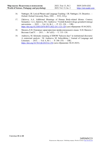 2. Zakirova, A.A. Additional Meanings of Human Body-related Idioms: Context, Semantics / A.A. Zakirova, M.I. Andreeva // Vestnik Kemerovskogo gosudarstvennogo universiteta. - 2022. - Vol. 24, № 1. - P. 121-128. - URL: 10.21603/2078-8975-2022-24-1-121-128 (дата обращения: 05.04.2025). DOI: 10.21603/2078-8975-2022-24-1-121-128( EDN: AREZSX