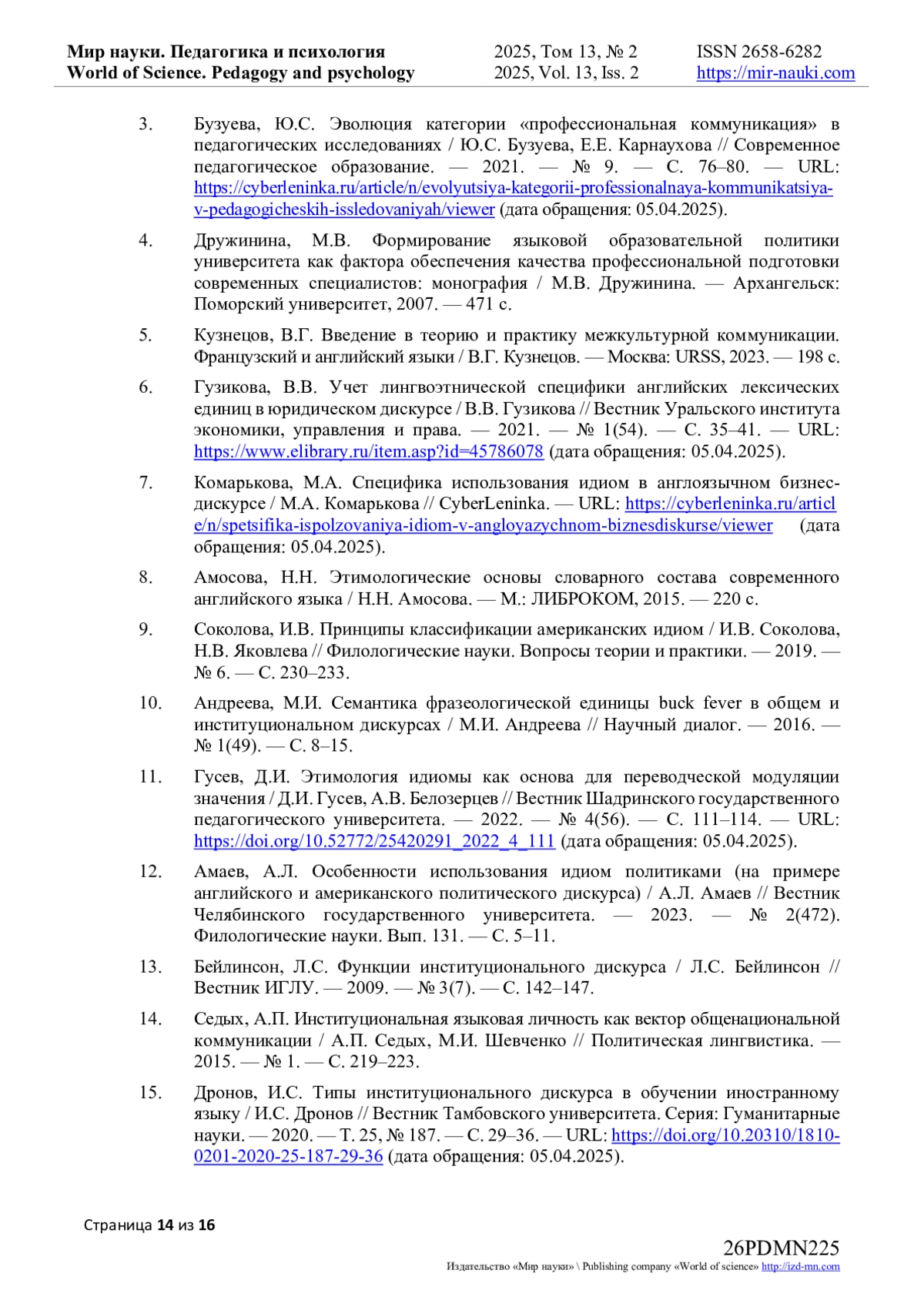 3. Бузуева, Ю.С. Эволюция категории “профессиональная коммуникация” в педагогических исследованиях / Ю.С. Бузуева, Е.Е. Карнаухова // Современное педагогическое образование. - 2021. - № 9. - С. 76-80. - URL: https://cyberleninka.ru/article/n/evolyutsiya-kategorii-professionalnaya-kommunikatsiya-v-pedagogicheskih-issledovaniyah/viewer (дата обращения: 05.04.2025). EDN: BBSPHS