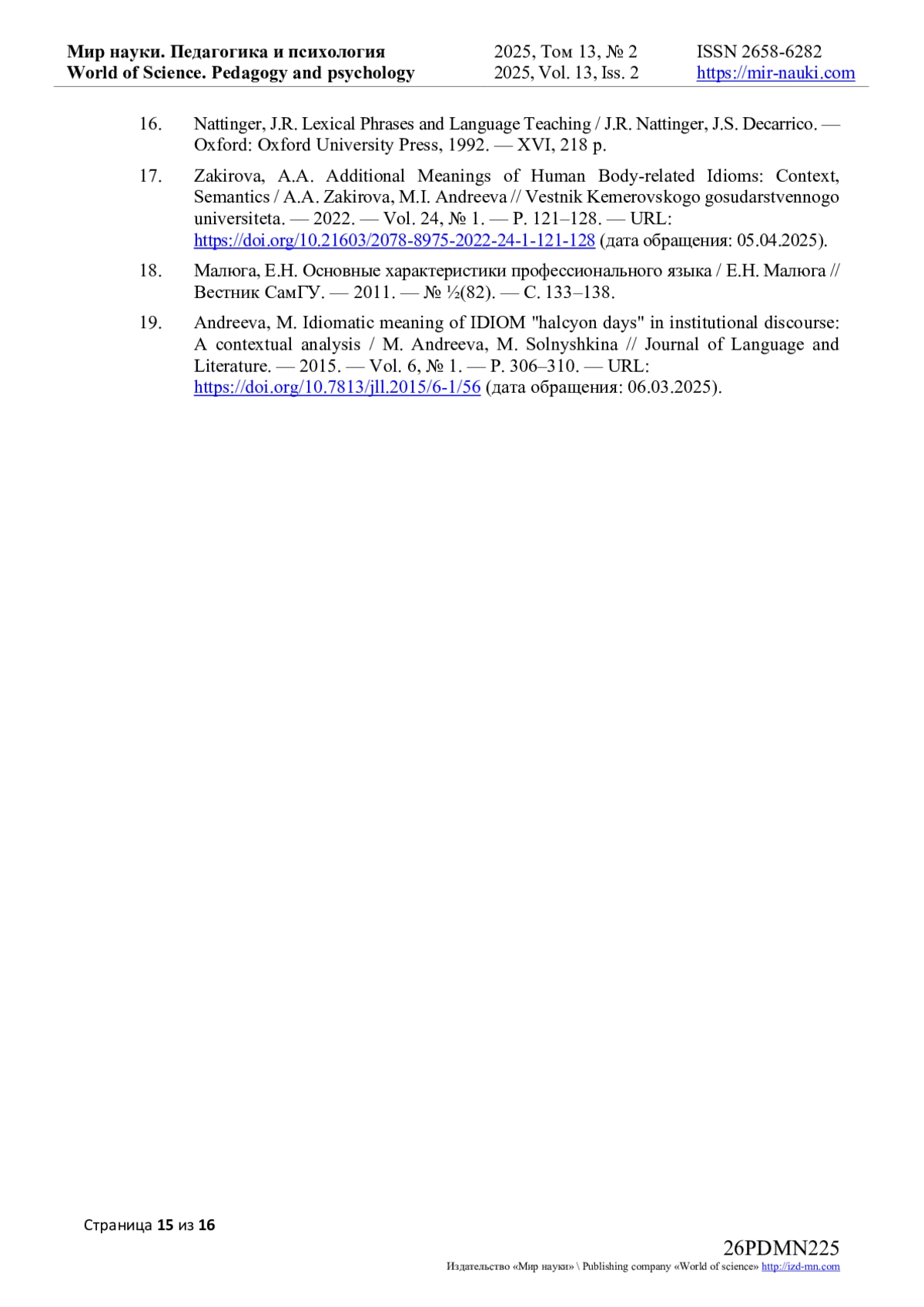 19. Andreeva, M. Idiomatic meaning of IDIOM “halcyon days” in institutional discourse: A contextual analysis / M. Andreeva, M. Solnyshkina // Journal of Language and Literature. - 2015. - Vol. 6, № 1. - P. 306-310. - 10.7813/jll.2015/6-1/56 (дата обращения: 06.03.2025). DOI: 10.7813/jll.2015/6-1/56( EDN: UEZBBD