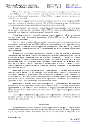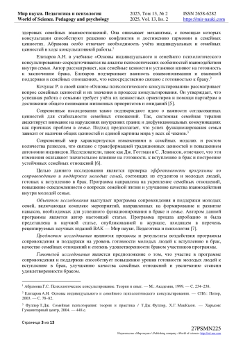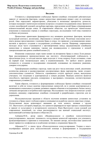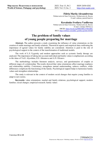 Автором представлено исследование, изучающее влияние ценностных ориентаций на создание устойчивых брачно-семейных отношений. Рассмотрены теоретические аспекты и эмпирические данные, подтверждающие значимость согласованных ценностей для стабильности семьи. Уделено внимание роли психологической поддержки в условиях трансформации традиционных моделей. Анализируются работы Л. С. Выготского и современные подходы, такие как системная семейная терапия. Подчеркивается важность учета индивидуальных и семейных ценностей, согласно идеям Ю. Е. Алёшиной, Г. С. Абрамовой и А. Н. Елизарова. Методология включает анализ литературы, опросы и анкетирование пар на разных этапах отношений. Результаты показали, что ценностные ориентации влияют на готовность к браку и стабильность отношений. Согласованность укрепляет взаимопонимание, снижает конфликты, тогда как различия осложняют функционирование семьи. Психологическая поддержка помогает гармонизировать семейные ценности и укрепить отношения. Исследование актуально в контексте современных социальных изменений, требующих адаптации молодых семей к новым нормам.