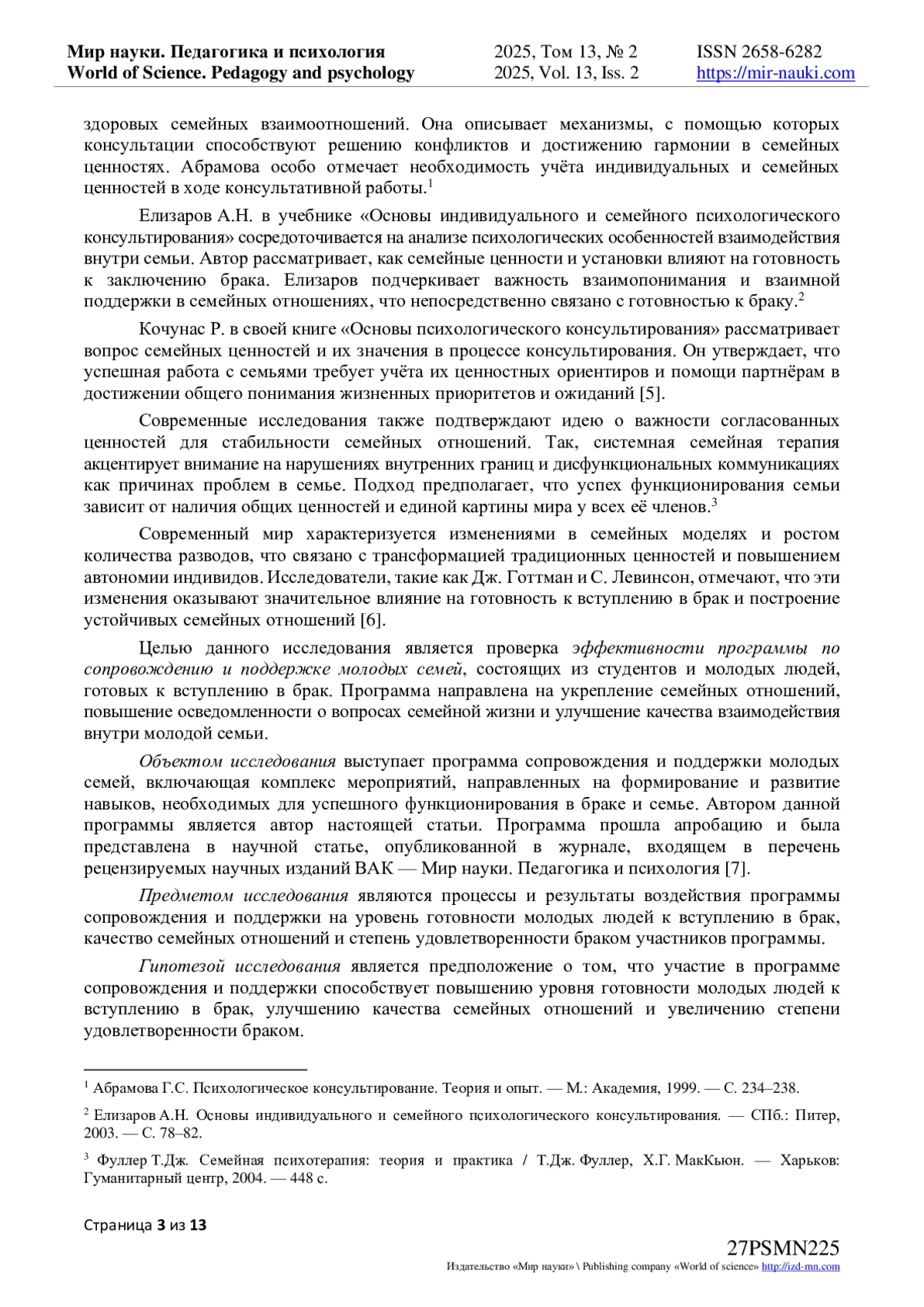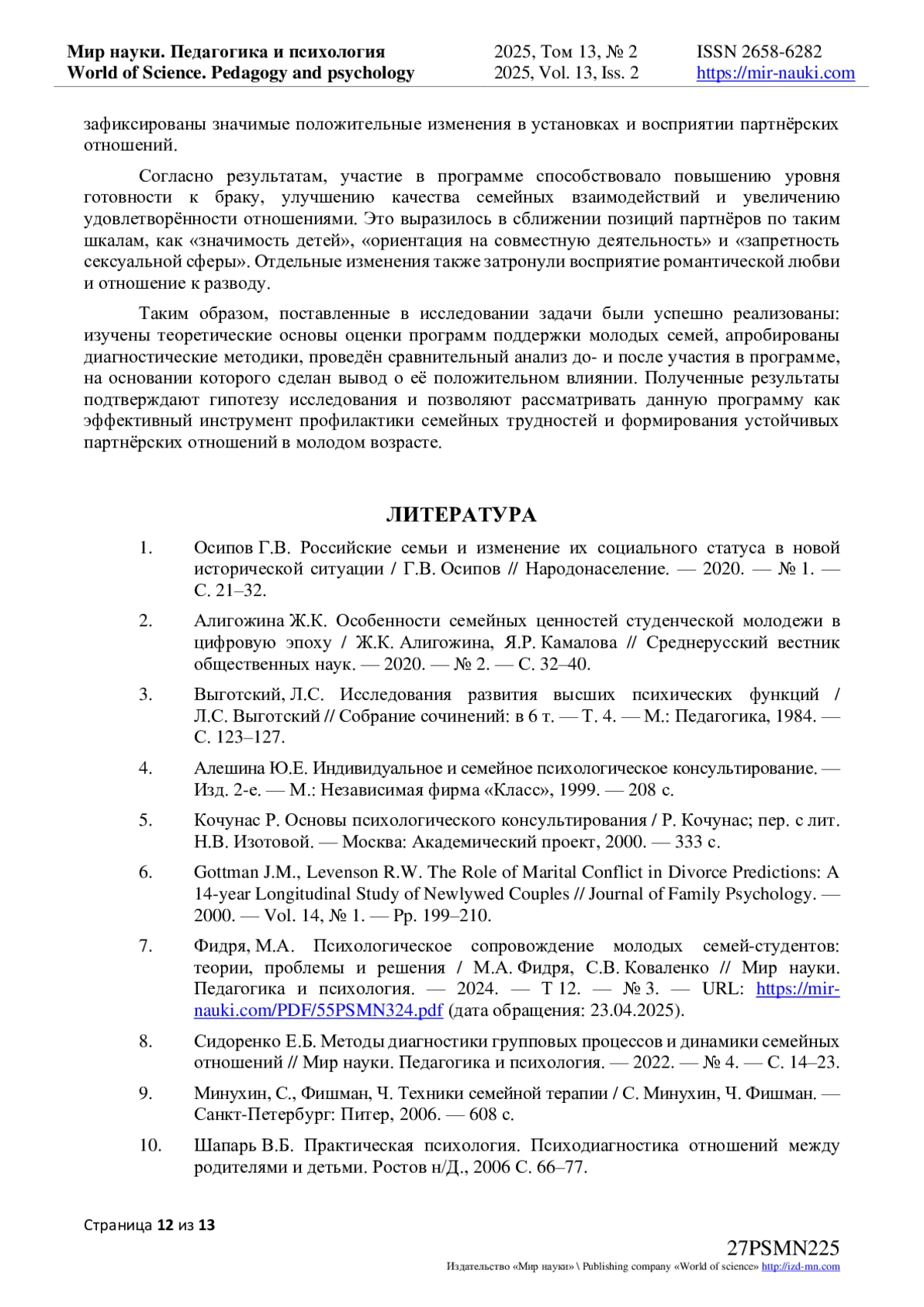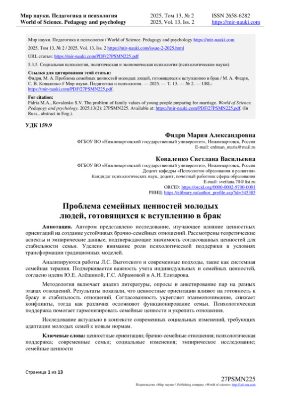 7. Фидря, М.А. Психологическое сопровождение молодых семей-студентов: теории, проблемы и решения / М.А. Фидря, С.В. Коваленко // Мир науки. Педагогика и психология. - 2024. - Т 12. - № 3. - URL: https://mir-nauki.com/PDF/55PSMN324.pdf (дата обращения: 23.04.2025). EDN: VLAGRZ