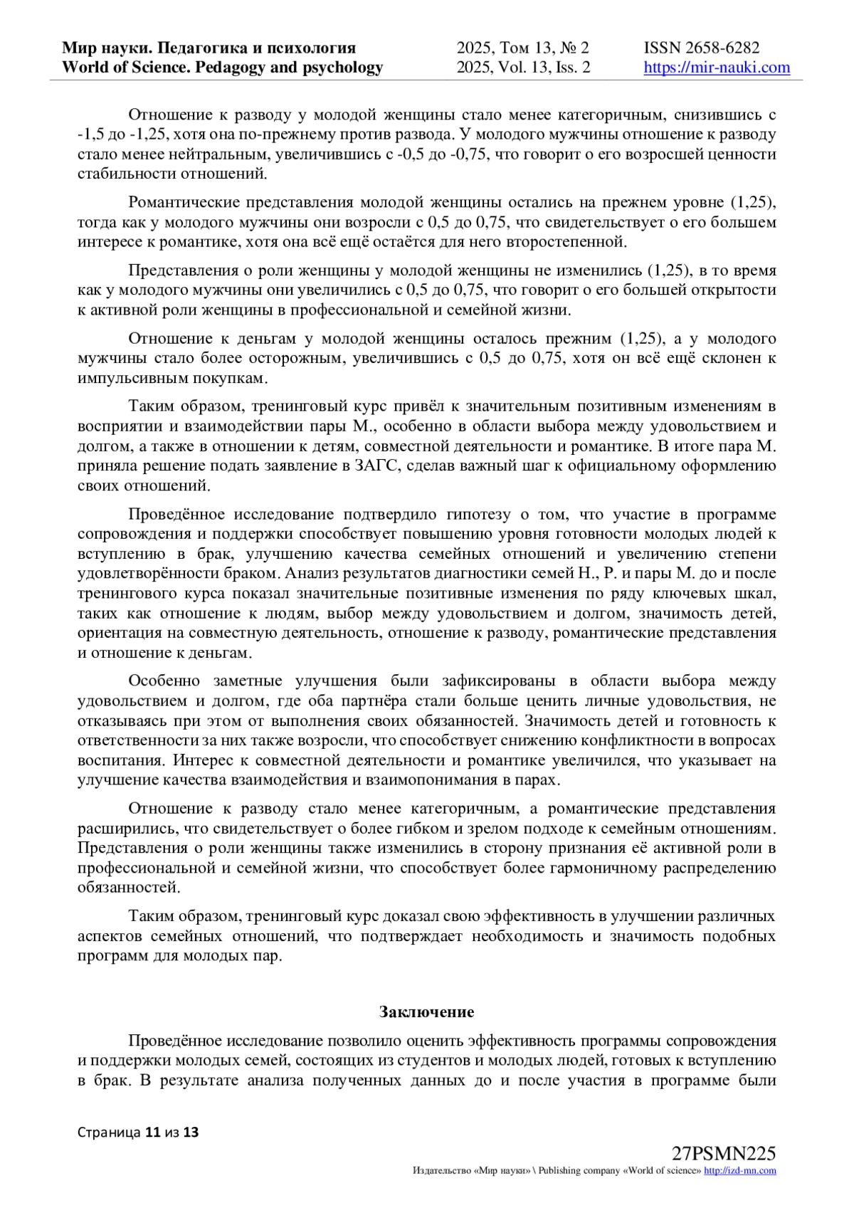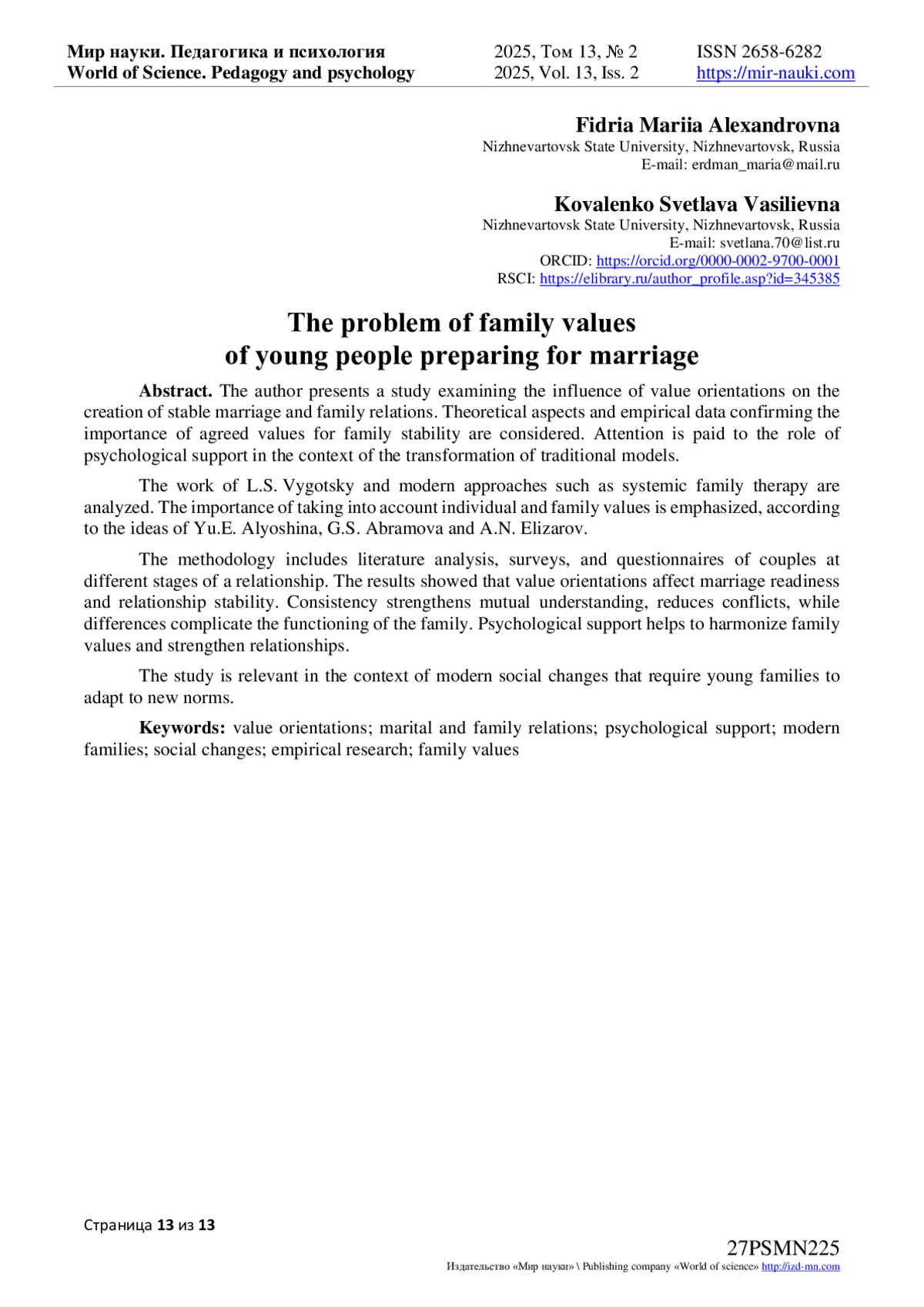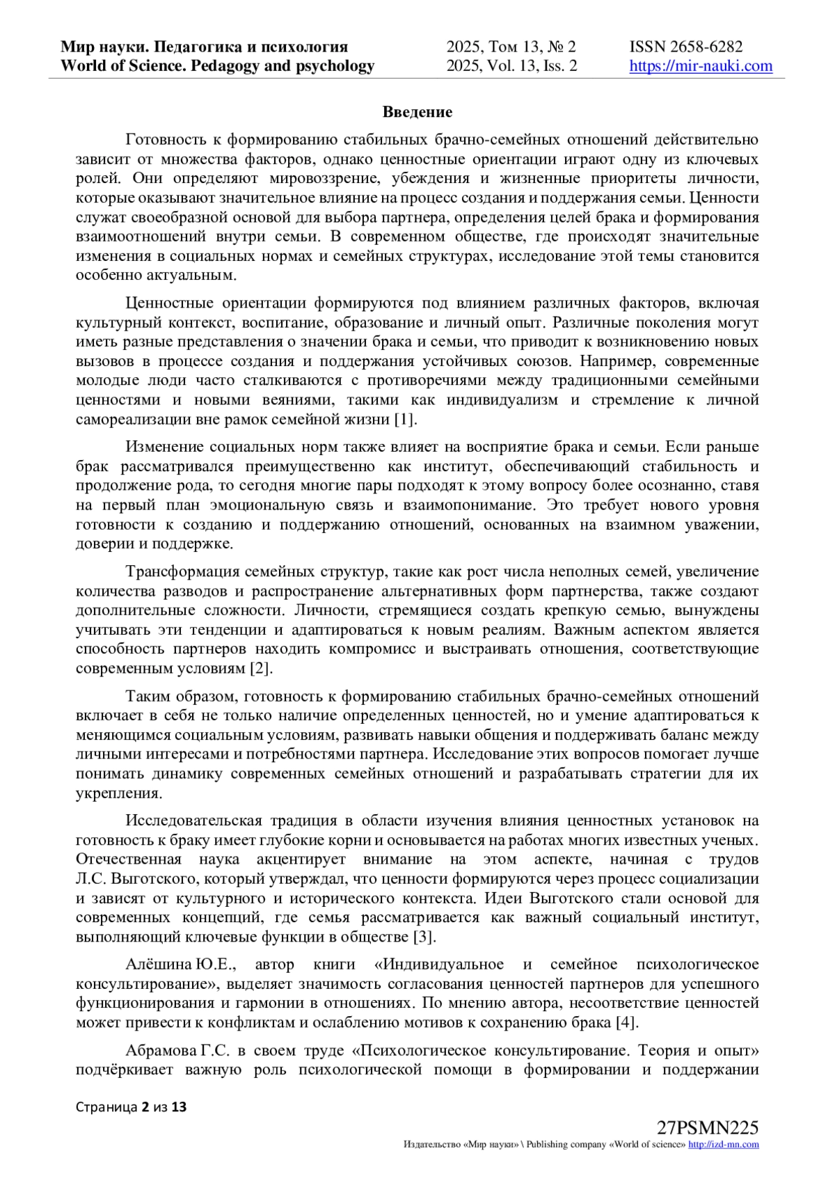 7. Фидря, М.А. Психологическое сопровождение молодых семей-студентов: теории, проблемы и решения / М.А. Фидря, С.В. Коваленко // Мир науки. Педагогика и психология. - 2024. - Т 12. - № 3. - URL: https://mir-nauki.com/PDF/55PSMN324.pdf (дата обращения: 23.04.2025). EDN: VLAGRZ
