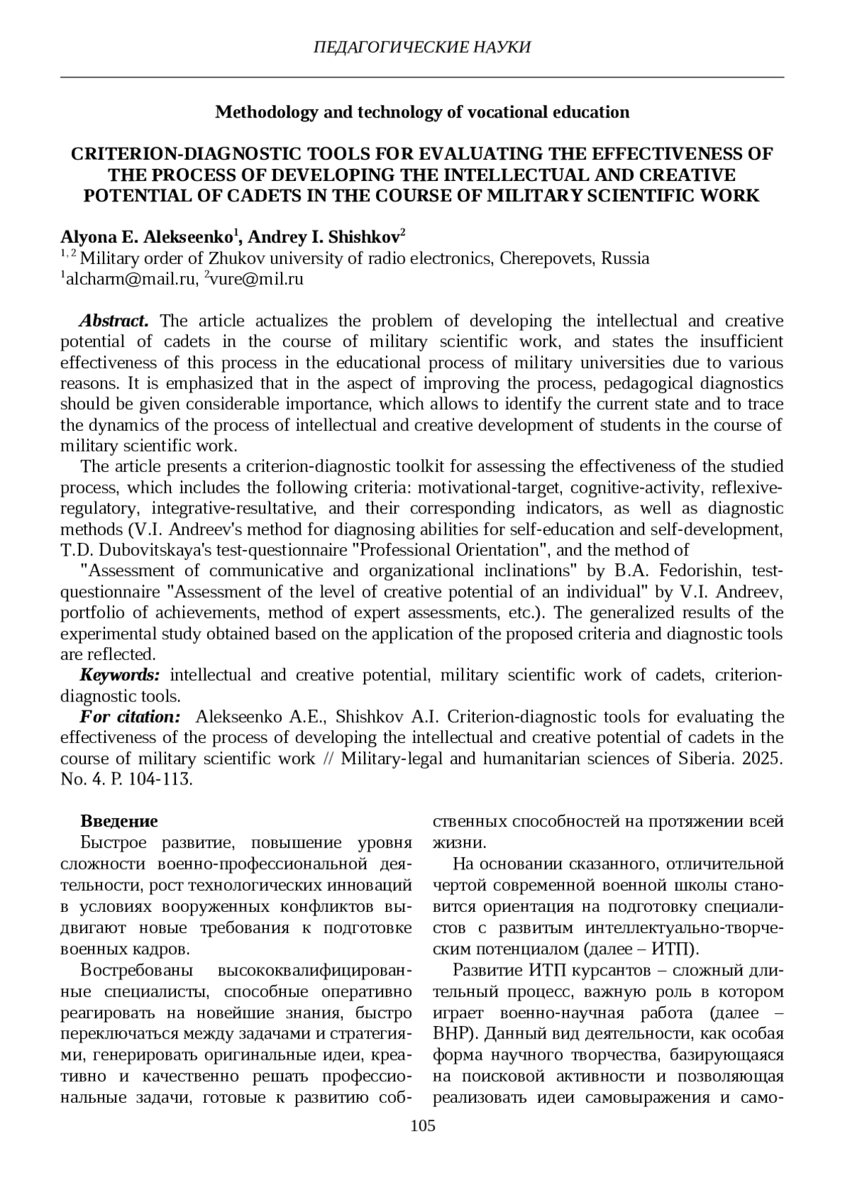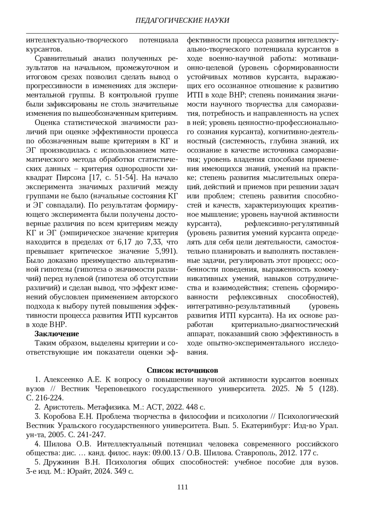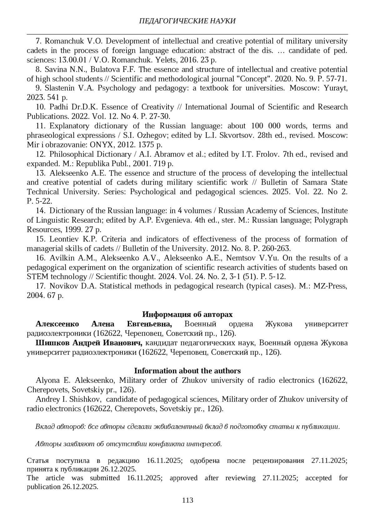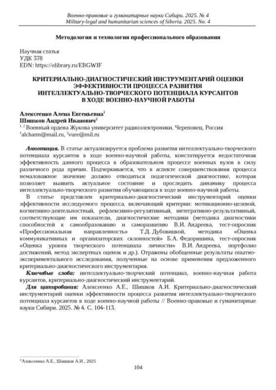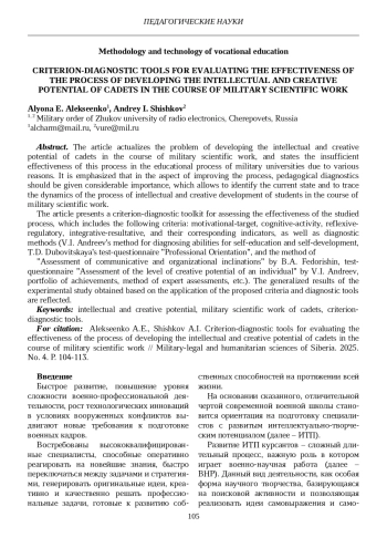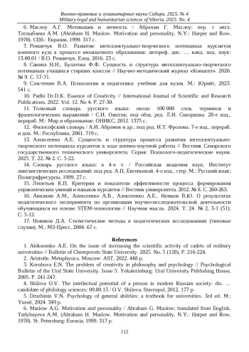 13. Алексеенко А.Е. Сущность и структура процесса развития интеллектуально-творческого потенциала курсантов в ходе военно-научной работы // Вестник Самарского государственного технического университета. Серия: Психолого-педагогические науки. 2025. Т. 22. № 2. С. 5-22. EDN: CMXPEL