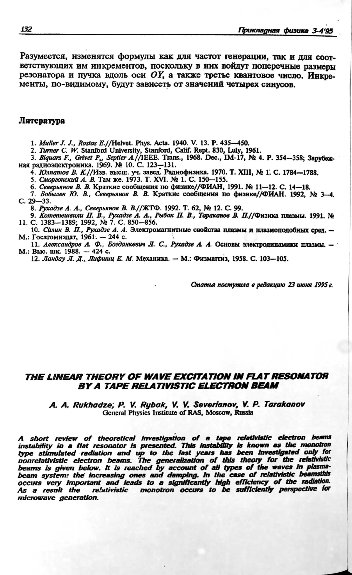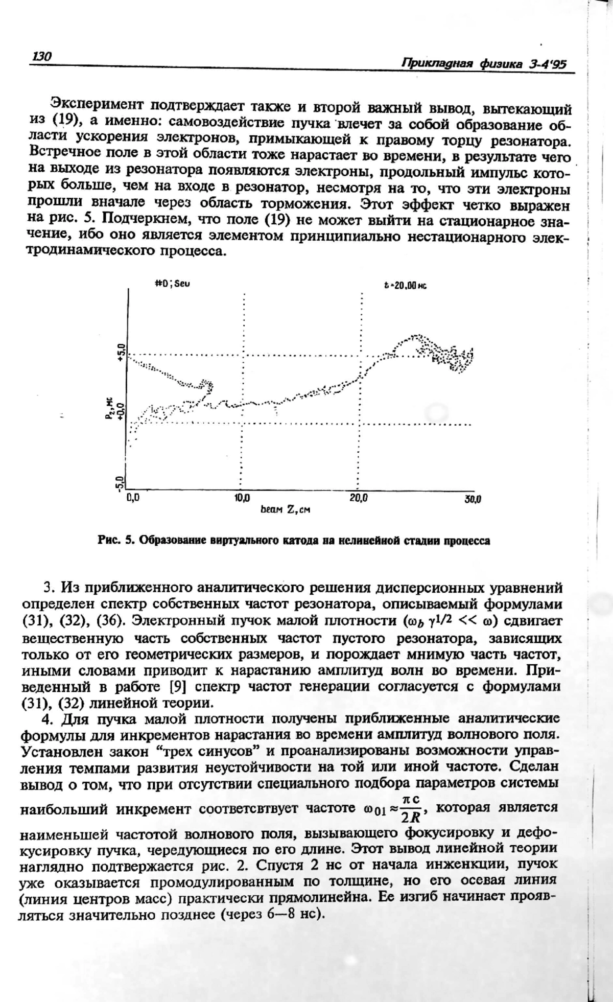 Сравнение изложенной выше теории, развитой в работе [8], приводит к выводу о том, что характер неустойчивости пучка в них одинаков. Разница заключается лишь в проявлениях этой неустойчивости: отсутствие сильного внешнего продольного магнитного поля открывает для электронов возможность реагировать на нарастающие по амплитуде поперечные силы, что позволяет по изменению формы пучка наблюдать визуально развитие неустойчивости во времени. В связи с этим авторы не ожидают чего-либо принципиально нового в случае трехмерного движения электронов. Разумеется, изменятся формулы как для частот генерации, так и для соответствующих им инкрементов, поскольку в них войдут поперечные размеры резонатора и пучка вдоль оси OY, а также третье квантовое число. Инкременты, по-видимому, будут зависеть от значений четырех синусов.