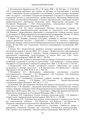 5. Асадов М.Э. Педагогические проблемы методики проведения занятий обучения иностранных граждан в системе МВД / М.Э. Асадов // Профессионально ориентированная языковая подготовка: теория и практика: сборник материалов всероссийской научно-практической конференции, Санкт-Петербург, 16 апреля 2025 года. СПб.: Санкт-Петербургский университет МВД РФ, 2025. С. 356-361.