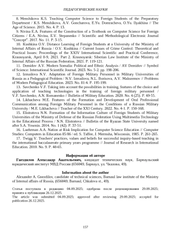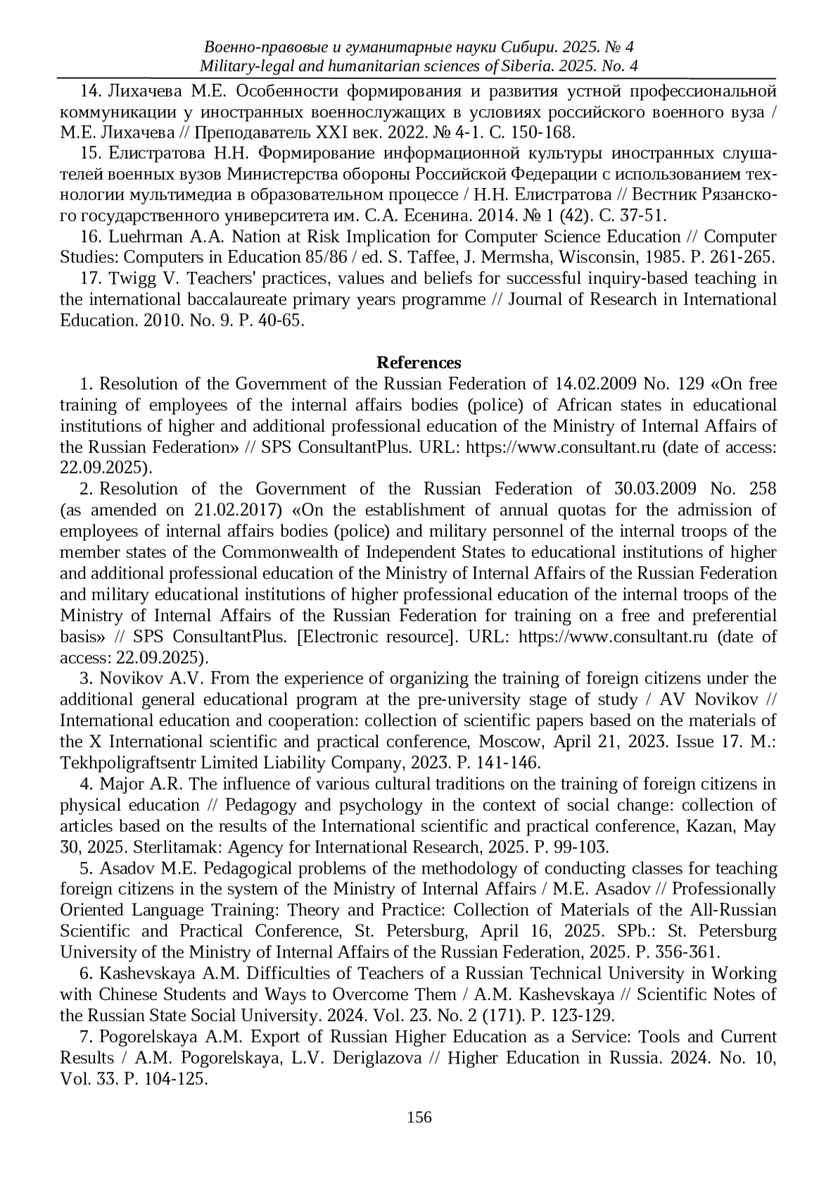 14. Лихачева М.Е. Особенности формирования и развития устной профессиональной коммуникации у иностранных военнослужащих в условиях российского военного вуза / М.Е. Лихачева // Преподаватель ХХI век. 2022. № 4-1. С. 150-168.