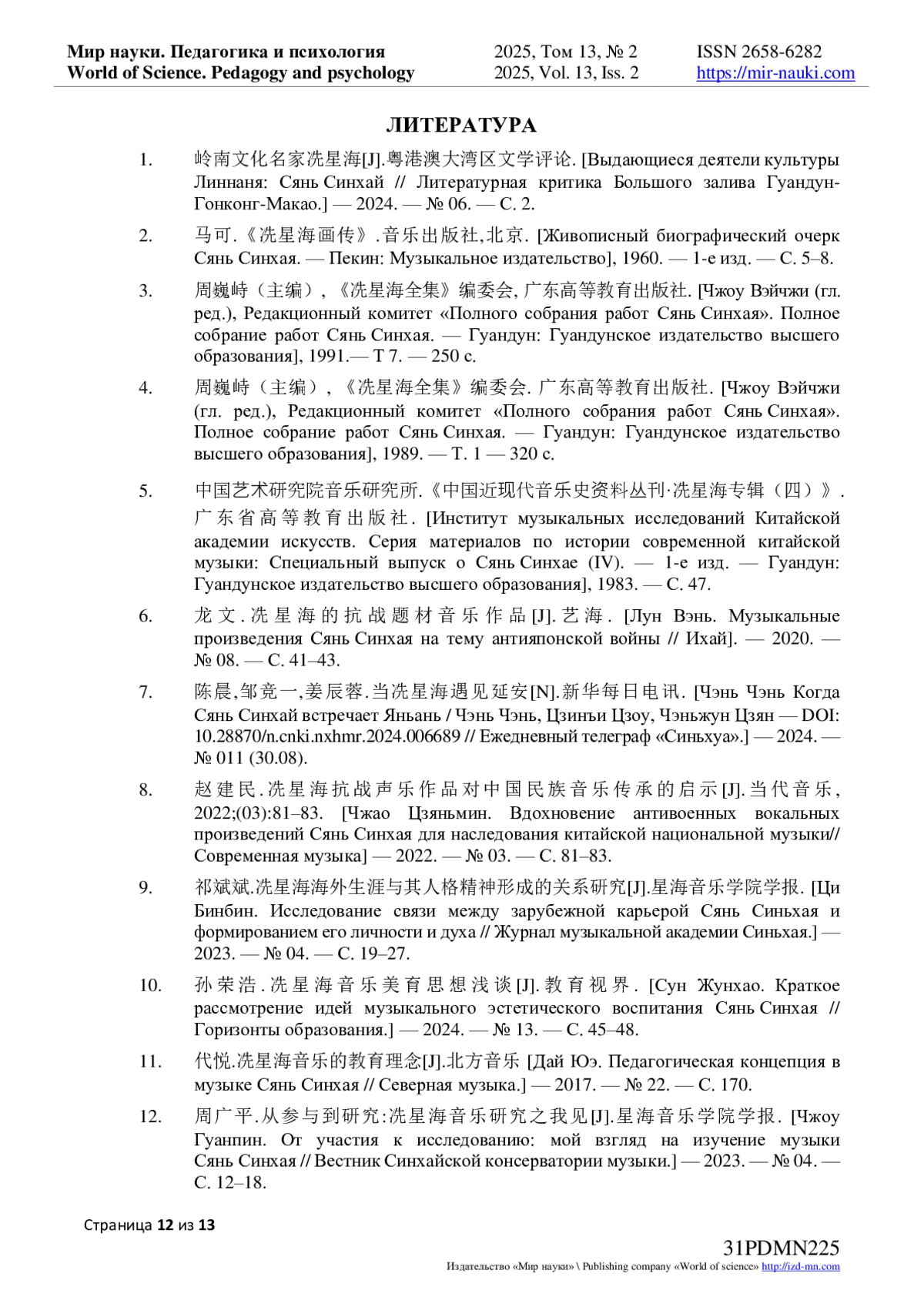 12. 周广平.从参与到研究:冼星海音乐研究之我见[J].星海音乐学院学报. [Чжоу Гуанпин. От участия к исследованию: мой взгляд на изучение музыки Сянь Синхая // Вестник Синхайской консерватории музыки.] - 2023. - № 04. - С. 12-18.