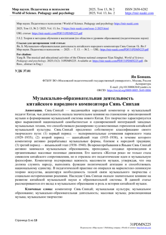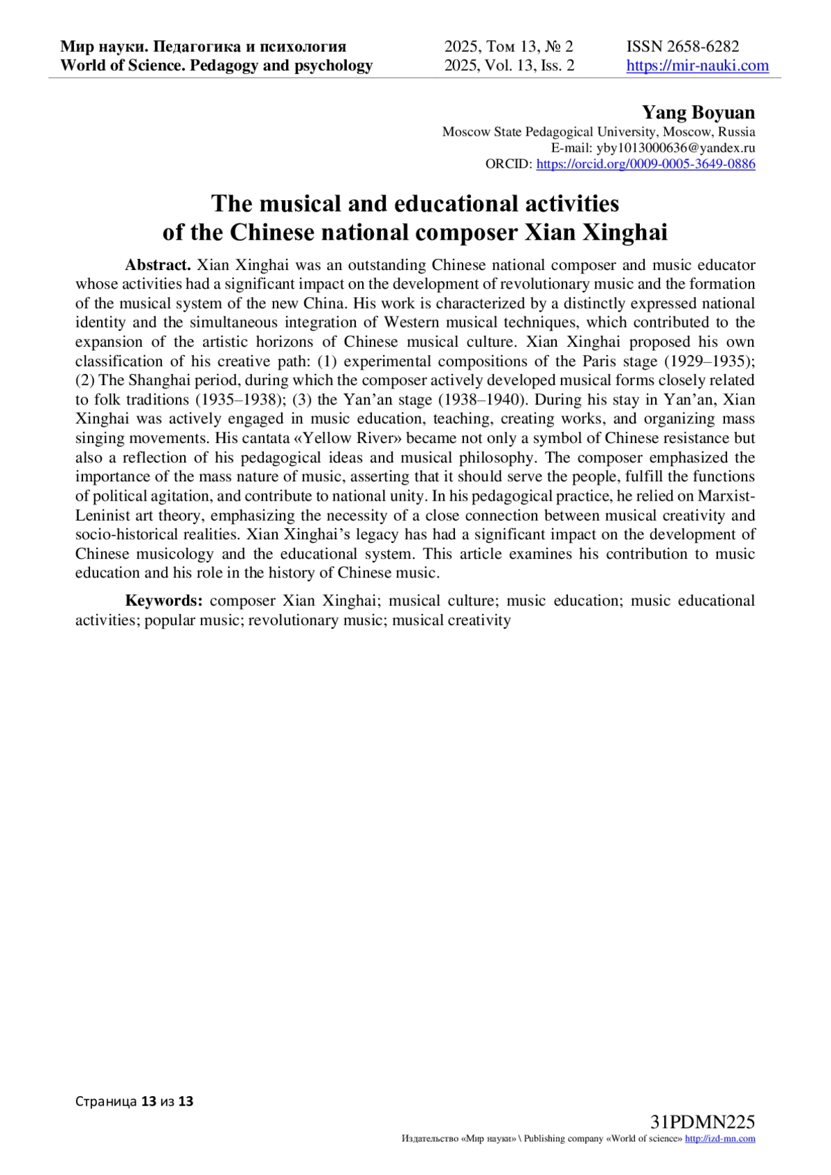 Сянь Синхай - выдающийся народный композитор и музыкальный педагог Китая, чья деятельность оказала значительное влияние на становление революционной музыки и формирование музыкальной системы нового Китая. Его творчество характеризуется ярко выраженной национальной самобытностью и одновременной интеграцией западных музыкальных техник, что способствовало расширению художественных горизонтов китайской музыкальной культуры. Сянь Синхай предложил собственную классификацию своего творческого пути: (1) первый период - экспериментальные сочинения парижского этапа (1929-1935); (2) второй период - шанхайский этап (1935-1938), в течение которого композитор активно разрабатывал музыкальные формы, близкие к народной традиции; (3) третий период - янъаньский этап (1938-1940). Во время пребывания в Яньане Сянь Синхай активно занимался музыкальным образованием, преподавал, создавал произведения и организовывал массовые песенные движения. Его кантата «Желтая река» не только стала символом китайского сопротивления, но и отразила его педагогические идеи и музыкальную философию. Композитор подчеркивал важность массовости музыки, утверждая, что она должна служить народу, выполнять функции политической агитации и способствовать национальному единству. В педагогической практике он опирался на марксистско-ленинскую теорию искусства, акцентируя необходимость тесной связи музыкального творчества с социально-историческими реалиями. Наследие Сянь Синхая оказало значительное влияние на развитие китайской музыкальной науки и образовательной системы. В данной статье рассматриваются его вклад в музыкальное образование и роль в истории китайской музыки.