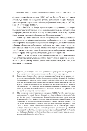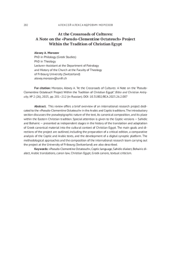 В настоящем обзоре предлагается краткое описание международного исследовательского проекта, посвящённого «Восьмикнижию Псевдо-Климента» в арабской и коптской традициях. Во вводной части рассматриваются псевдоэпиграфическая природа текста, его канонический состав и место в восточнохристианской традиции. Особое внимание уделяется коптским версиям - сахидской и бохайрской, представленным как самостоятельные этапы в истории перевода и адаптации греческого канонического материала в культурный контекст христианского Египта. Излагаются основные цели и направления проекта, включающие подготовку критического издания, сравнительный анализ коптского и арабского текста, а также разработку цифровой синоптической платформы. Отдельно описываются методологические подходы и состав международной исследовательской группы, реализующей проект во Фрибурском университете (Швейцария).