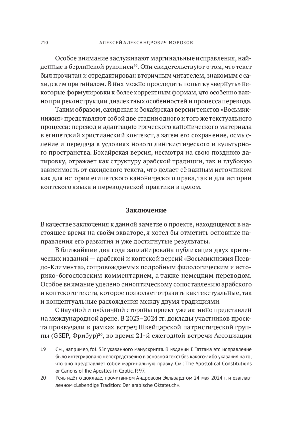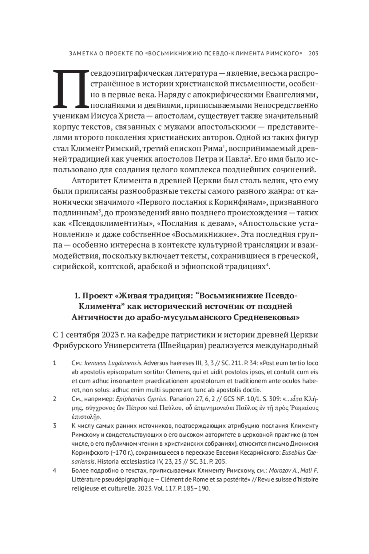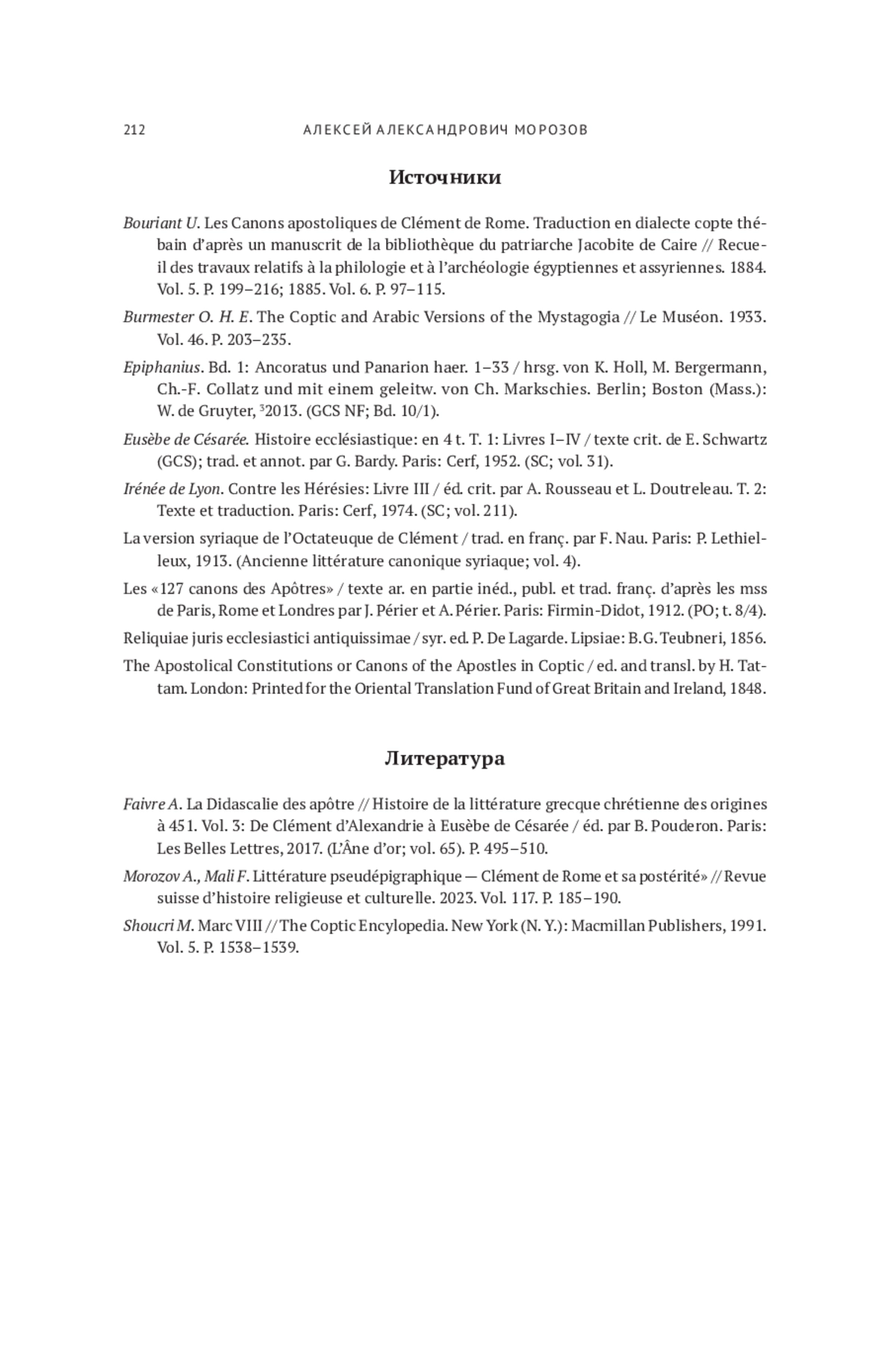 11. Morozov A., Mali F. Littérature pseudépigraphique - Clément de Rome et sa postérité“ // Revue suisse d’histoire religieuse et culturelle. 2023. Vol. 117. P. 185-190.