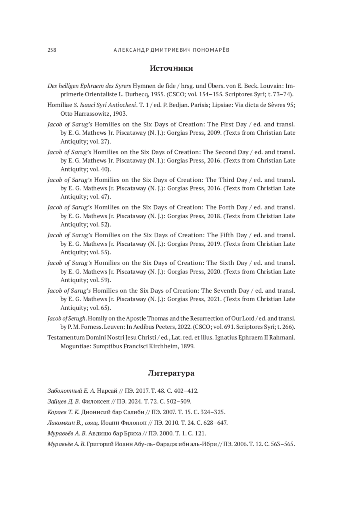 8. Jacob of Sarug’s Homilies on the Six Days of Creation: The Sixth Day / ed. and transl. by E. G. Mathews Jr. Piscataway (N. J.): Gorgias Press, 2020. (Texts from Christian Late Antiquity; vol. 59).