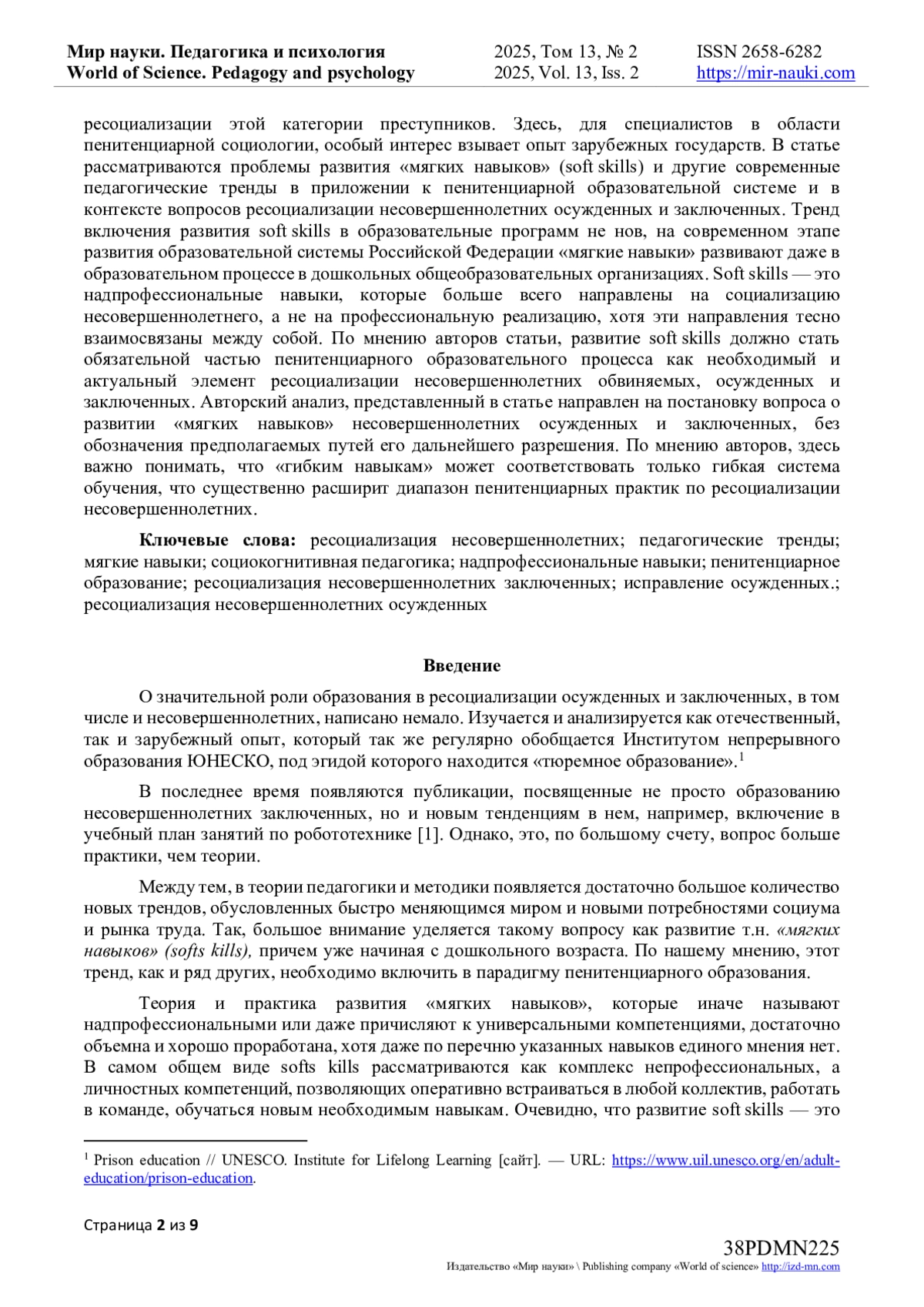 Несовершеннолетние осужденные и заключенные традиционно рассматриваются в качестве своеобразного «резерва» рецидивной преступности. В этой связи особую актуальность приобретают новации в области пенитенциарных практик по ресоциализации этой категории преступников. Здесь, для специалистов в области пенитенциарной социологии, особый интерес взывает опыт зарубежных государств. В статье рассматриваются проблемы развития «мягких навыков» (soft skills) и другие современные педагогические тренды в приложении к пенитенциарной образовательной системе и в контексте вопросов ресоциализации несовершеннолетних осужденных и заключенных. Тренд включения развития soft skills в образовательные программ не нов, на современном этапе развития образовательной системы Российской Федерации «мягкие навыки» развивают даже в образовательном процессе в дошкольных общеобразовательных организациях. Soft skills - это надпрофессиональные навыки, которые больше всего направлены на социализацию несовершеннолетнего, а не на профессиональную реализацию, хотя эти направления тесно взаимосвязаны между собой. По мнению авторов статьи, развитие soft skills должно стать обязательной частью пенитенциарного образовательного процесса как необходимый и актуальный элемент ресоциализации несовершеннолетних обвиняемых, осужденных и заключенных. Авторский анализ, представленный в статье направлен на постановку вопроса о развитии «мягких навыков» несовершеннолетних осужденных и заключенных, без обозначения предполагаемых путей его дальнейшего разрешения. По мнению авторов, здесь важно понимать, что «гибким навыкам» может соответствовать только гибкая система обучения, что существенно расширит диапазон пенитенциарных практик по ресоциализации несовершеннолетних.