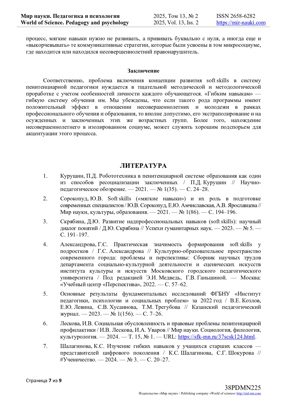 1. Курушин, П.Д. Робототехника в пенитенциарной системе образования как один из способов ресоциализации заключенных / П.Д. Курушин // Научно-педагогическое обозрение. - 2021. - № 1(35). - С. 24-28. EDN: DTRYWU