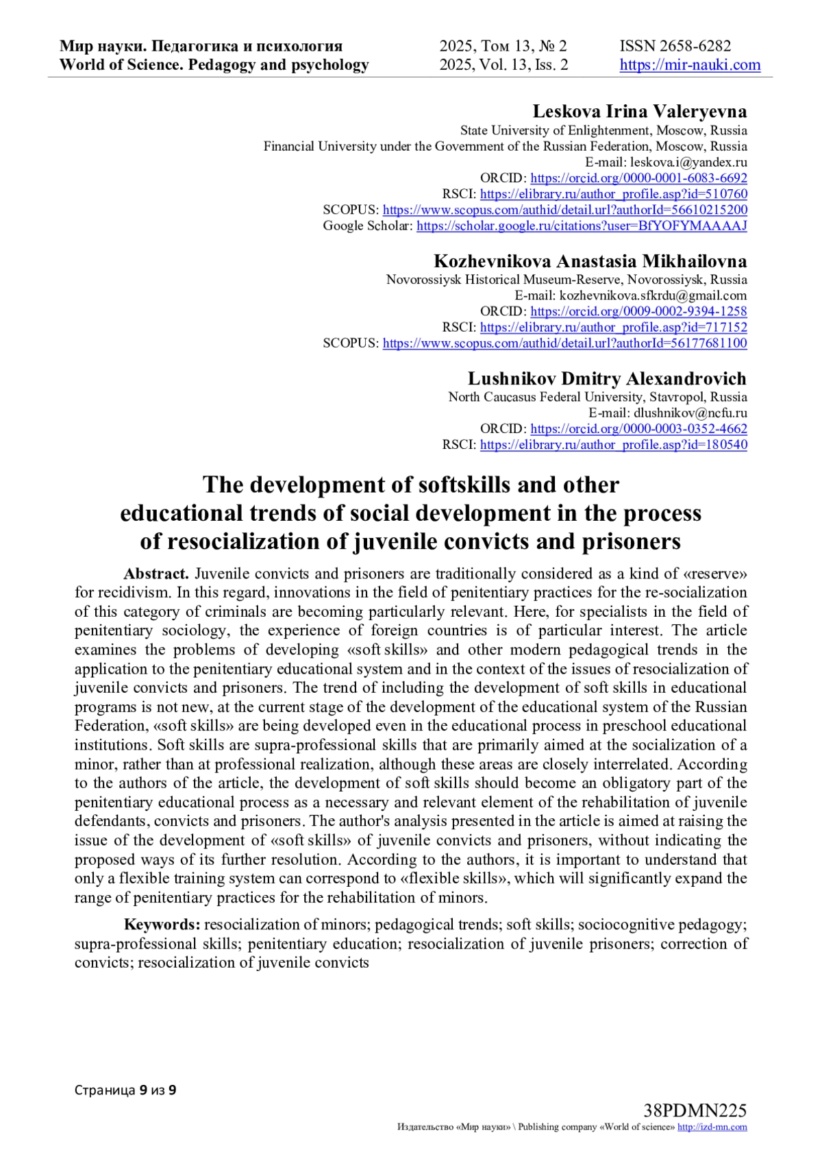 9. Лескова, И.В. Формирование положительных жизненных установок у несовершеннолетних осужденных в процессе пенитенциарной профилактики / И.В. Лескова, И.А. Уваров // Социальная политика и народосбережение. - 2023. - Том 2 - № 2. - URL: https://spnjournal.ru/06spn223.html.