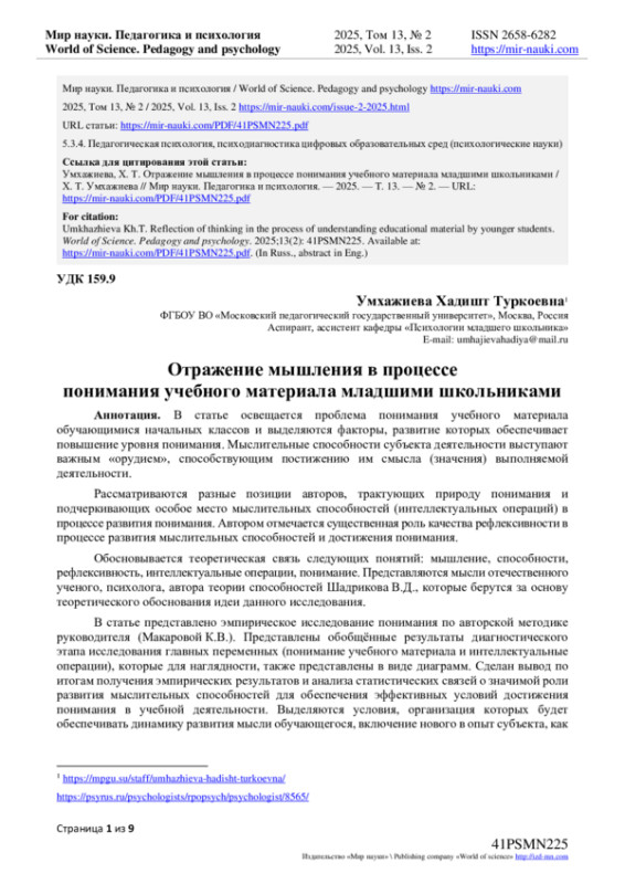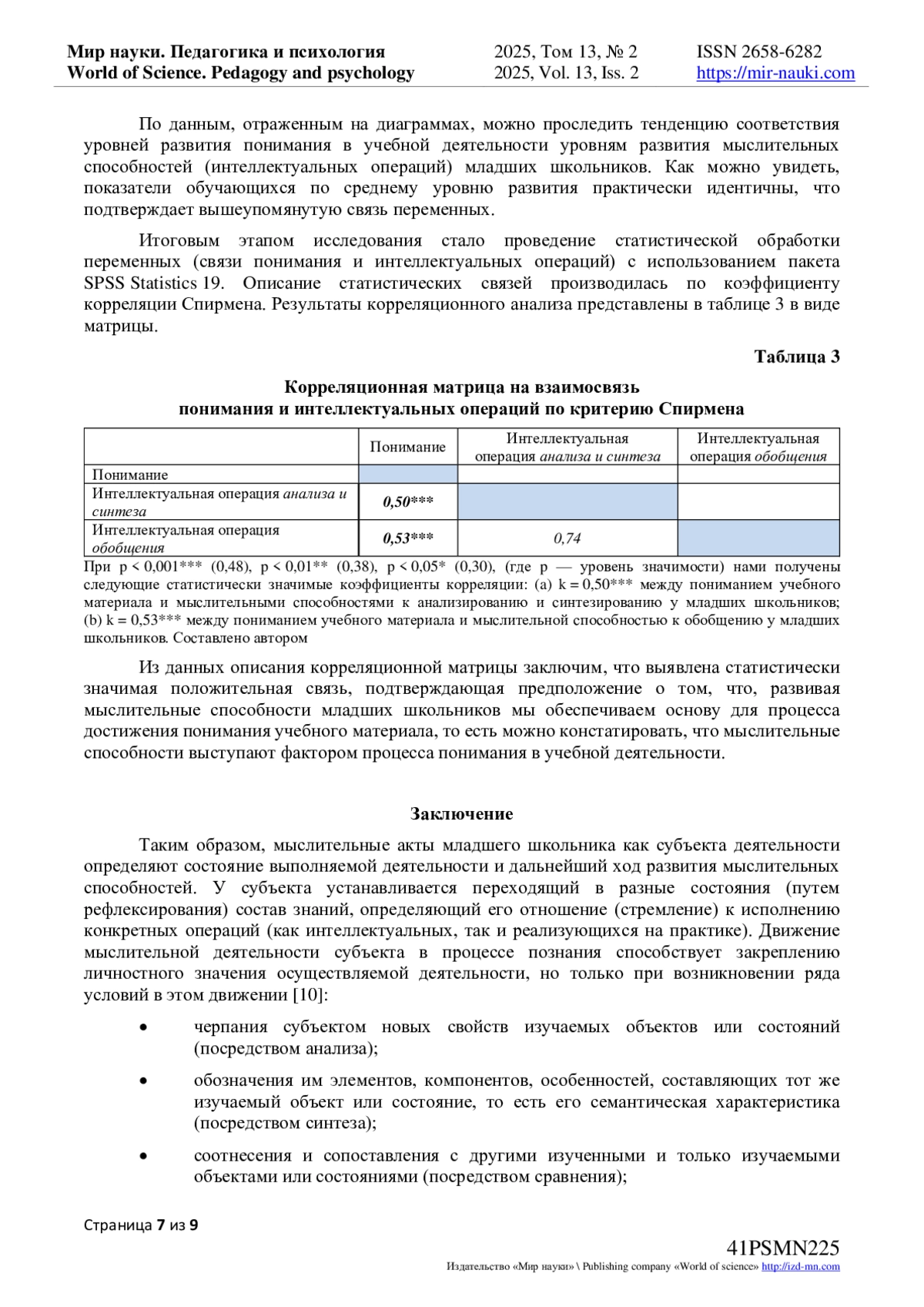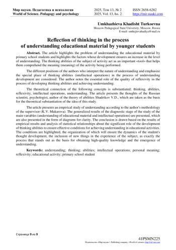 В статье освещается проблема понимания учебного материала обучающимися начальных классов и выделяются факторы, развитие которых обеспечивает повышение уровня понимания. Мыслительные способности субъекта деятельности выступают важным «орудием», способствующим постижению им смысла (значения) выполняемой деятельности. Рассматриваются разные позиции авторов, трактующих природу понимания и подчеркивающих особое место мыслительных способностей (интеллектуальных операций) в процессе развития понимания. Автором отмечается существенная роль качества рефлексивности в процессе развития мыслительных способностей и достижения понимания. Обосновывается теоретическая связь следующих понятий: мышление, способности, рефлексивность, интеллектуальные операции, понимание. Представляются мысли отечественного ученого, психолога, автора теории способностей Шадрикова В. Д., которые берутся за основу теоретического обоснования идеи данного исследования. В статье представлено эмпирическое исследование понимания по авторской методике руководителя (Макаровой К. В.). Представлены обобщённые результаты диагностического этапа исследования главных переменных (понимание учебного материала и интеллектуальные операции), которые для наглядности, также представлены в виде диаграмм. Сделан вывод по итогам получения эмпирических результатов и анализа статистических связей о значимой роли развития мыслительных способностей для обеспечения эффективных условий достижения понимания в учебной деятельности. Выделяются условия, организация которых будет обеспечивать динамику развития мысли обучающегося, включение нового в опыт субъекта, как именно того процесса, который выделяется основой для получения качественного знания и возникновения понимания.