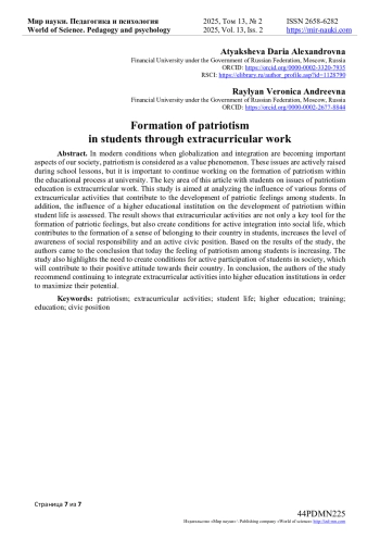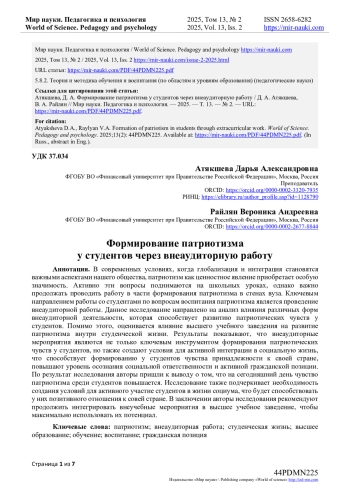 В современных условиях, когда глобализация и интеграция становятся важными аспектами нашего общества, патриотизм как ценностное явление приобретает особую значимость. Активно эти вопросы поднимаются на школьных уроках, однако важно продолжать проводить работу в части формирования патриотизма в стенах вуза. Ключевым направлением работы со студентами по вопросам воспитания патриотизма является проведение внеаудиторной работы. Данное исследование направлено на анализ влияния различных форм внеаудиторной деятельности, которая способствует развитию патриотических чувств у студентов. Помимо этого, оценивается влияние высшего учебного заведения на развитие патриотизма внутри студенческой жизни.