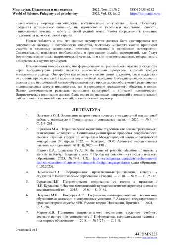 3. Pikalova E.A., Lomakina Ye.A. On the issue of patriotic education of university students in foreign language classes // Проблемы современного педагогического образования. 2023. № 79-4. URL: https://cyberleninka.ru/article/n/on-the-issue-of-patriotic-education-of-university-students-in-foreign-language-classes (дата обращения: 01.02.2025). EDN: YZWUDE