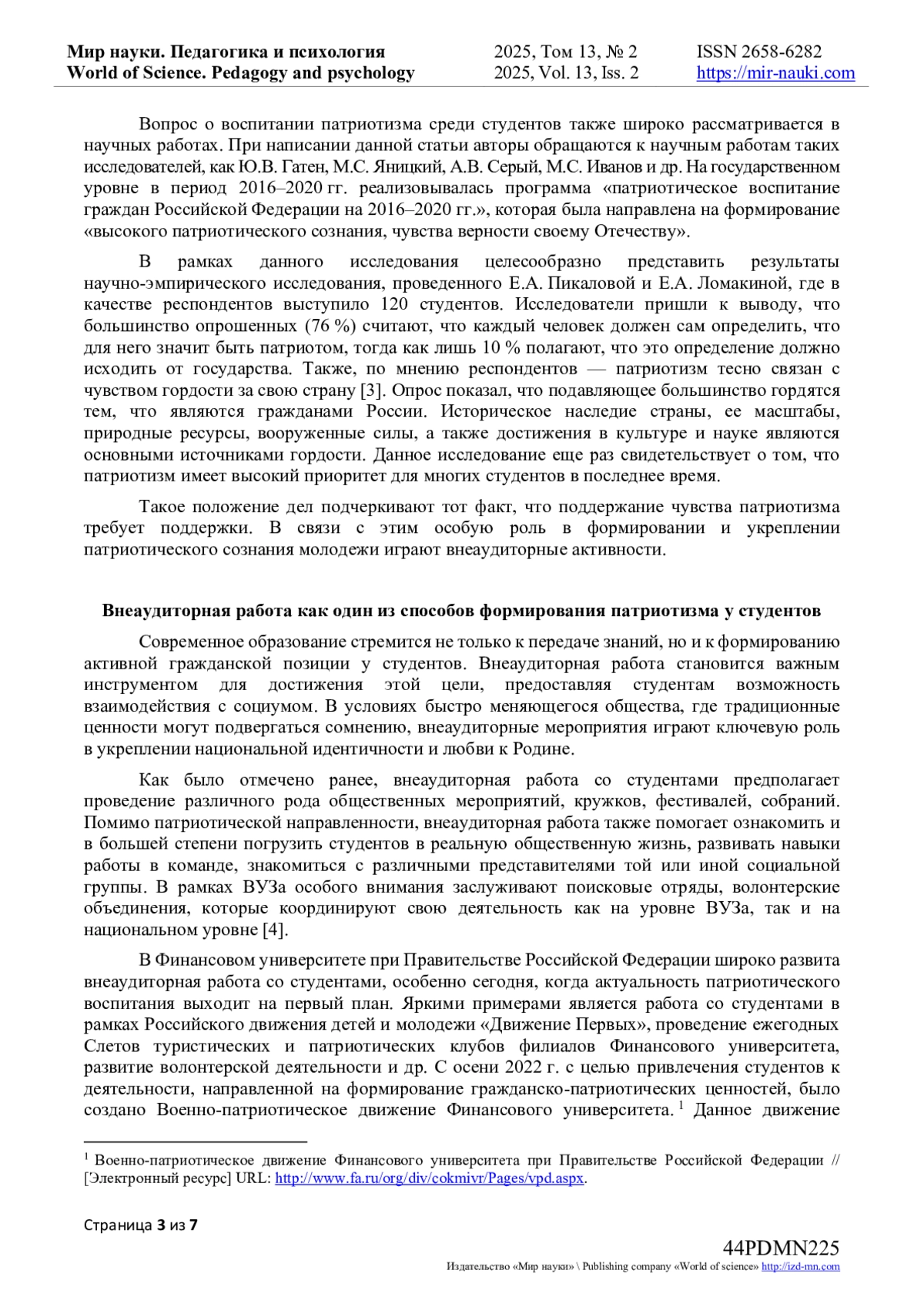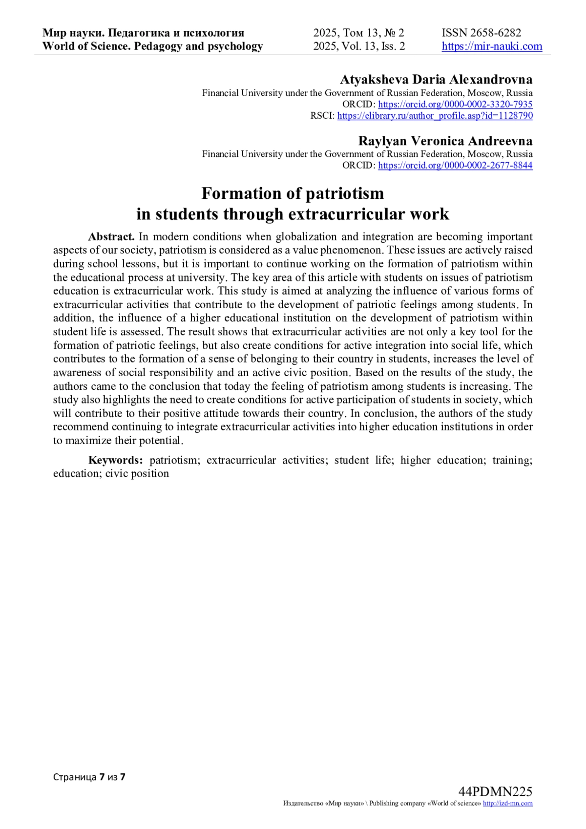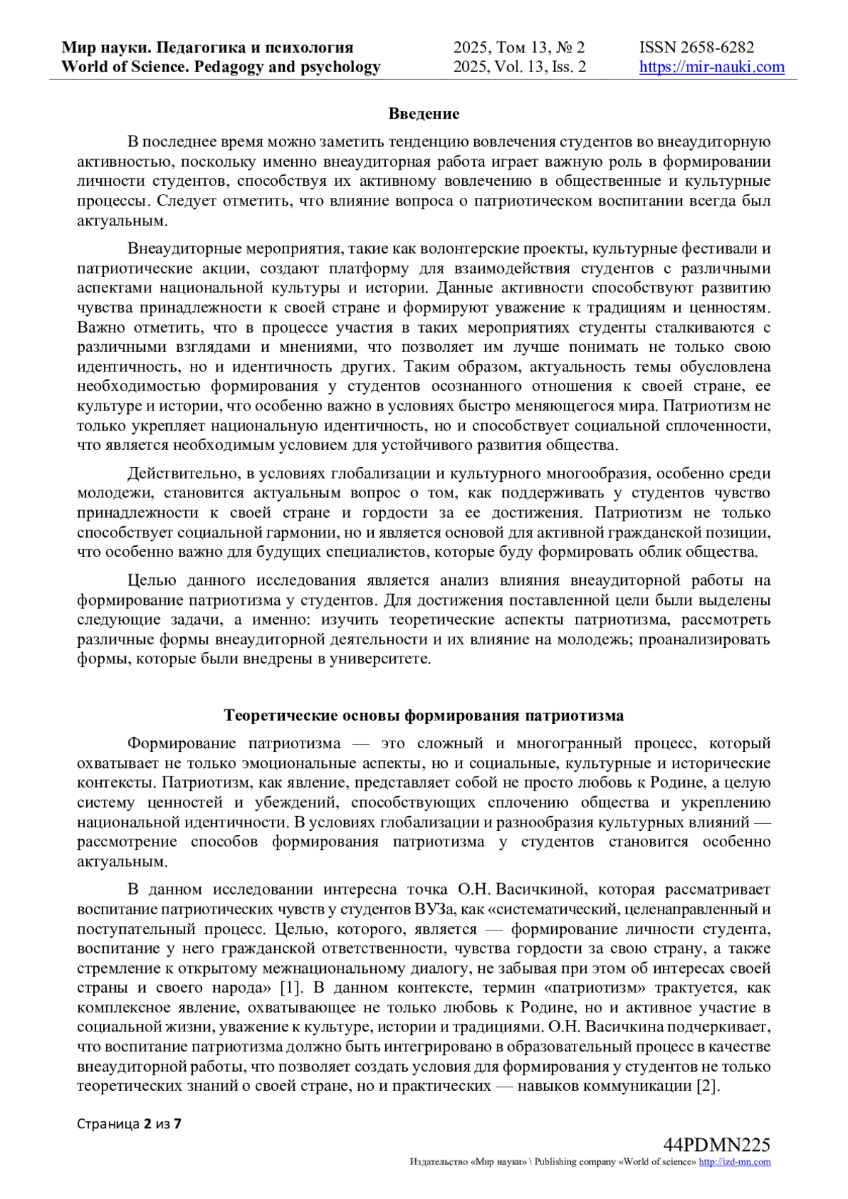 1. Васичкина О.Н. Воспитание патриотизма в процессе внеаудиторной и аудиторной работы с молодежью // Гуманитарные и социальные науки. - 2020. - № 4. - С. 254-261. EDN: KIGURE