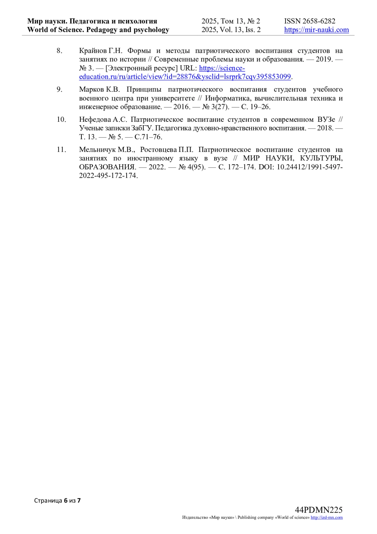 8. Крайнов Г.Н. Формы и методы патриотического воспитания студентов на занятиях по истории // Современные проблемы науки и образования. - 2019. - № 3. - [Электронный ресурс] URL: https://science-education.ru/ru/article/view?id=28876&ysclid=lsrprk7cqv395853099. EDN: PETFDV