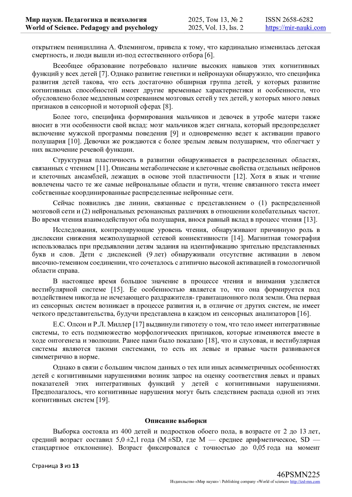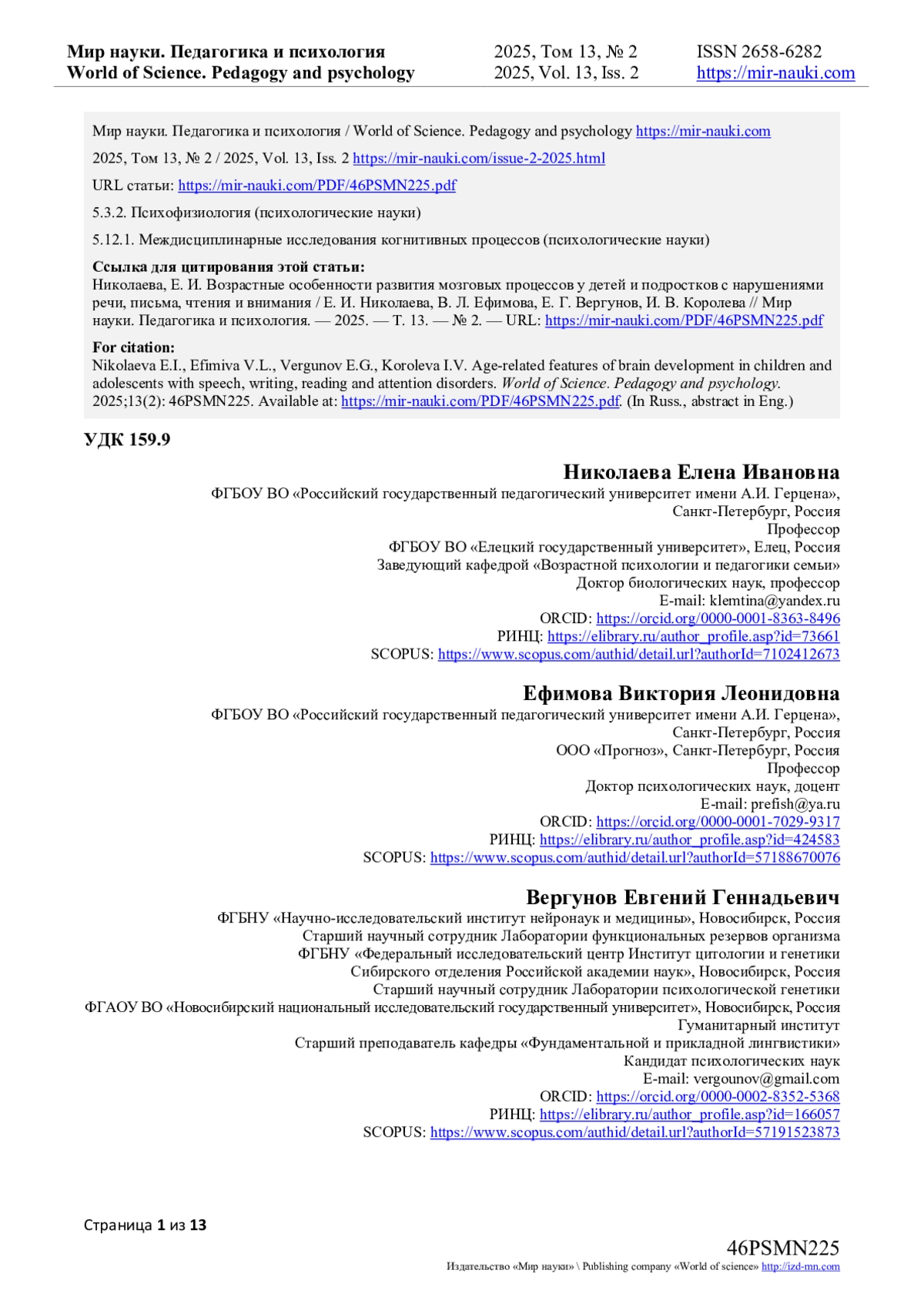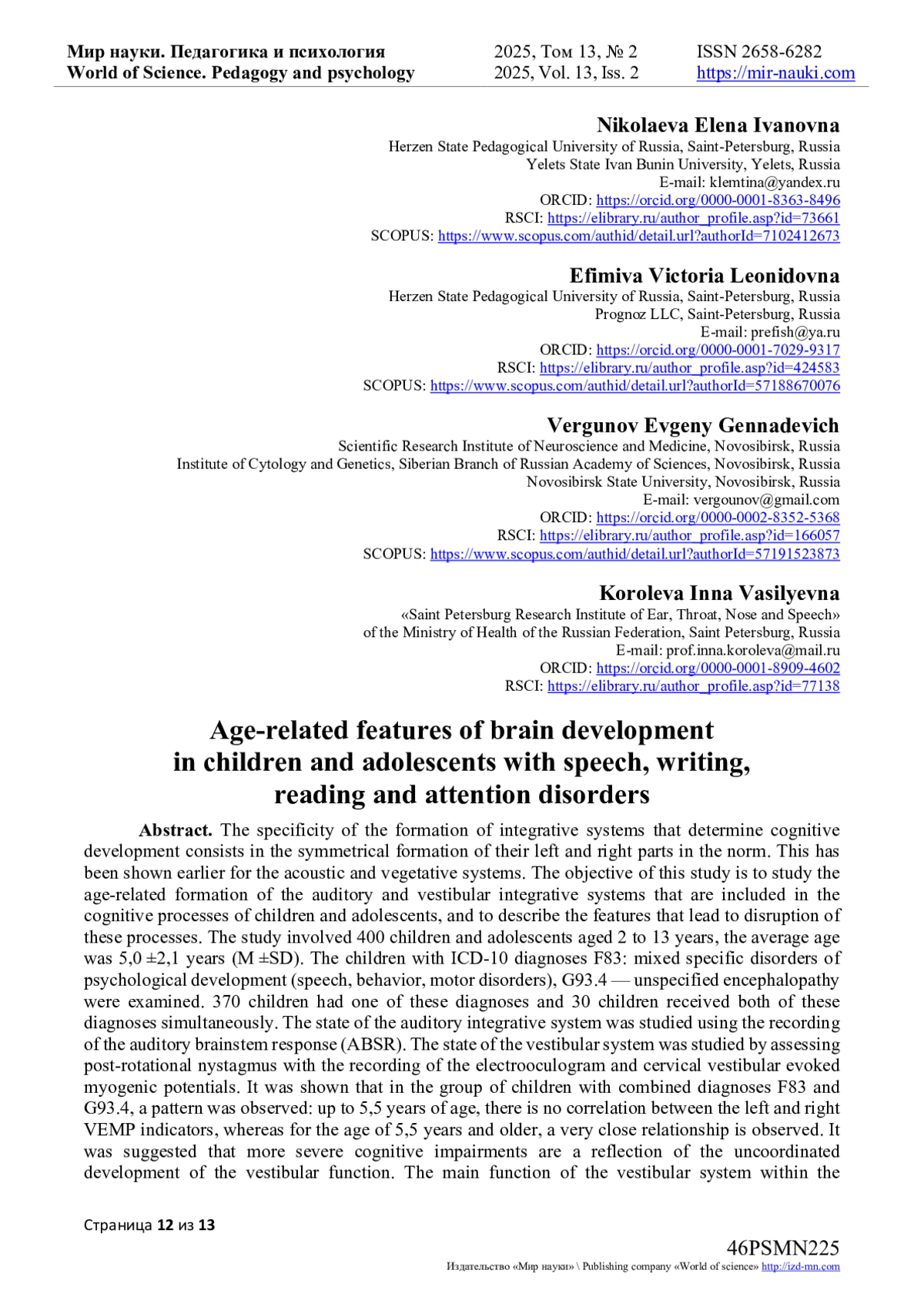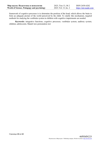 18. Nikolaeva E.I., Efimova V.L., Vergunov E.G.Integration of Vestibular and Auditory Information in Ontogenesis // Children. - 2022. - Vol. 9(3). - Article number: 401. DOI: 10.3390/children9030401 EDN: GKDREM