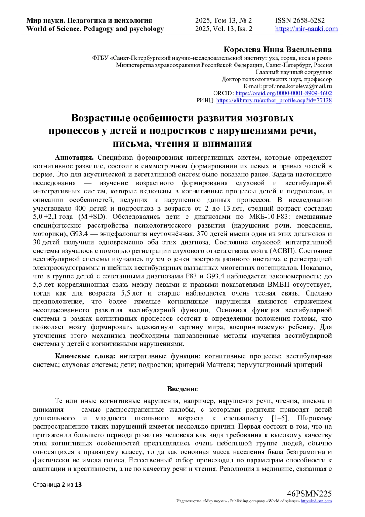 Задача настоящего исследования - изучение возрастного формирования слуховой и вестибулярной интегративных систем, которые включены в когнитивные процессы детей и подростков, и описании особенностей, ведущих к нарушению данных процессов. В исследовании участвовало 400 детей и подростков в возрасте от 2 до 13 лет, средний возраст составил 5,0 ±2,1 года (M ±SD). Обследовались дети с диагнозами по МКБ-10 F83: смешанные специфические расстройства психологического развития (нарушения речи, поведения, моторики), G93.4 - энцефалопатия неуточнённая. 370 детей имели один из этих диагнозов и 30 детей получили одновременно оба этих диагноза. Состояние слуховой интегративной системы изучалось с помощью регистрации слухового ответа ствола мозга (АСВП). Состояние вестибулярной системы изучалось путем оценки постротационного нистагма с регистрацией электроокулограммы и шейных вестибулярных вызванных миогенных потенциалов. Показано, что в группе детей с сочетанными диагнозами F83 и G93.4 наблюдается закономерность: до 5,5 лет корреляционная связь между левыми и правыми показателями ВМВП отсутствует, тогда как для возраста 5,5 лет и старше наблюдается очень тесная связь. Сделано предположение, что более тяжелые когнитивные нарушения являются отражением несогласованного развития вестибулярной функции. Основная функция вестибулярной системы в рамках когнитивных процессов состоит в определении положения головы, что позволяет мозгу формировать адекватную картину мира, воспринимаемую ребенку. Для уточнения этого механизма необходимы направленные методы изучения вестибулярной системы у детей с когнитивными нарушениями.