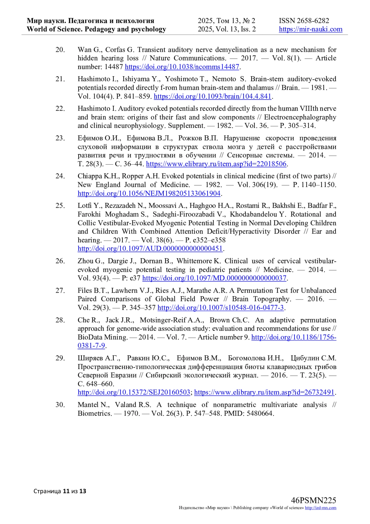 23. Ефимов О.И., Ефимова В.Л., Рожков В.П. Нарушение скорости проведения слуховой информации в структурах ствола мозга у детей с расстройствами развития речи и трудностями в обучении // Сенсорные системы. - 2014. - Т. 28(3). - С. 36-44. item.asp?id=22018506. EDN: SNVPOD