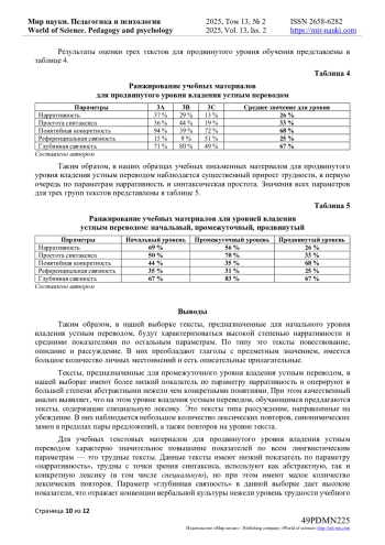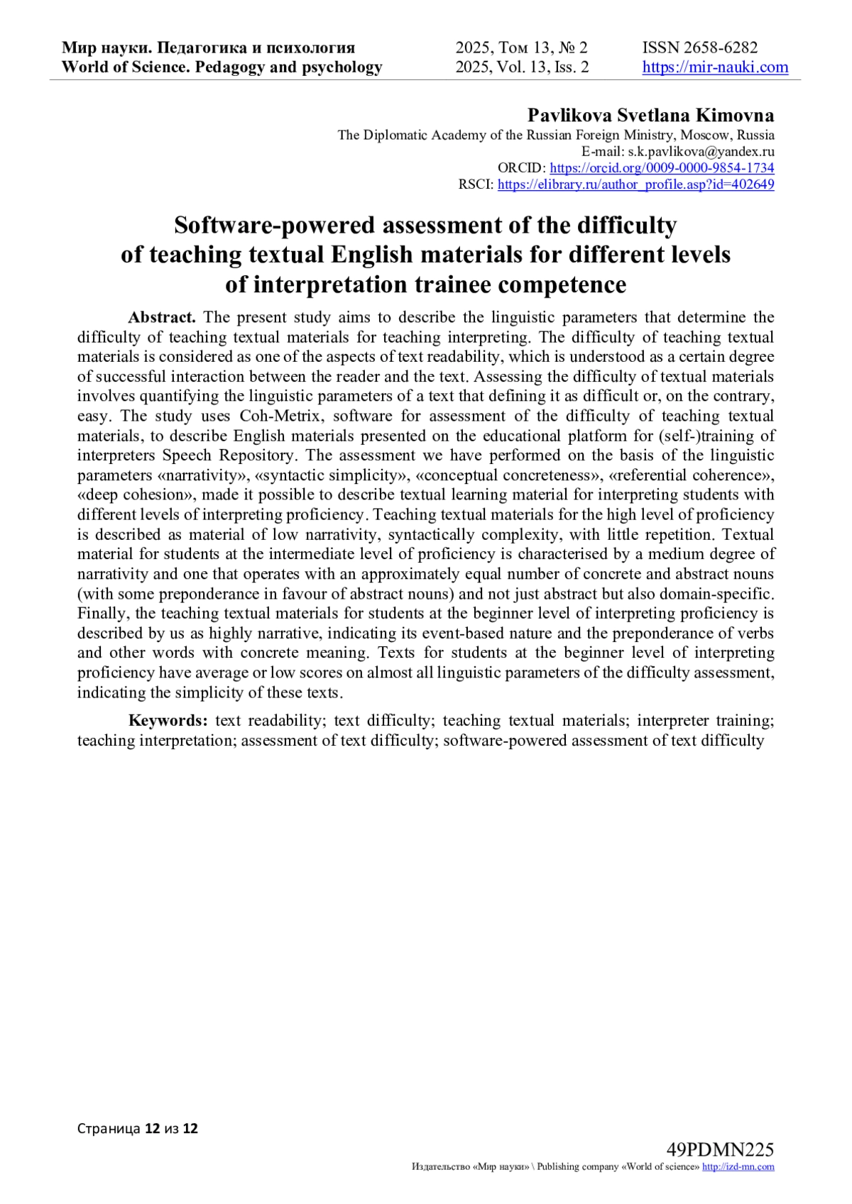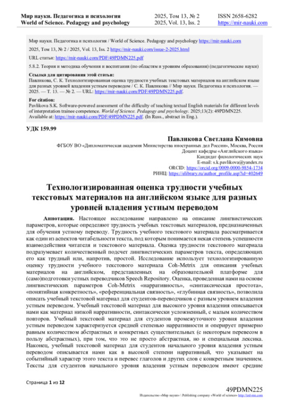 Настоящее исследование направлено на описание лингвистических параметров, которые определяют трудность учебных текстовых материалов, предназначенных для обучения устному переводу. Трудность учебного текстового материала рассматривается как один из аспектов читабельности текста, под которым понимается некая степень успешности взаимодействия читателя и текстового материала. Оценка трудности текстового материала подразумевает количественный подсчет лингвистических параметров текста, определяющих его как трудный или, напротив, простой. Исследование использует технологизированную оценку трудности учебного текстового материала Coh-Metrix для описания учебных материалов на английском, представленных на образовательной платформе для (само)подготовки устных переводчиков Speech Repository. Оценка, проведенная нами на основе лингвистических параметров Coh-Metrix «нарративность», «синтаксическая простота», «понятийная конкретность», «референциальная связность», «глубинная связность», позволила описать учебный текстовой материал для студентов-переводчиков с разным уровнем владения устным переводом. Учебный текстовой материал для высокого уровня владения описывается нами как материал низкой нарративности, синтаксически усложненный, с малым количеством повторов. Учебный текстовой материал для студентов промежуточного уровня владения устным переводом характеризуется средней степенью нарративности и оперирует примерно равным количеством абстрактных и конкретных существительных (с некоторым перевесом в пользу абстрактных), при том, что это не просто абстрактная, но и специальная лексика. Наконец, учебный текстовой материал для студентов начального уровня владения устным переводом описывается нами как в высокой степени нарративный, что указывает на событийный характер этого текста и перевес глаголов и других слов с конкретным значением. Тексты для студентов начального уровня владения устным переводом имеют средние (невысокие) показатели почти по всем лингвистическим параметрам оценки трудности, что указывает на простоту данных текстов.